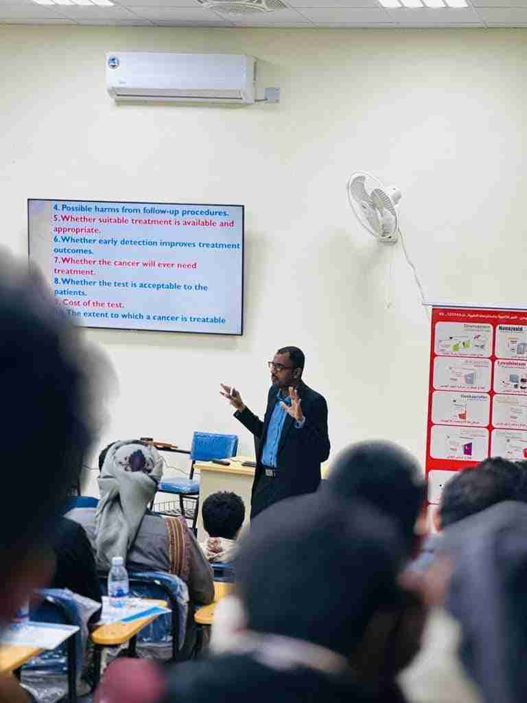 برعاية معالي أ.د. قاسم بحيبح وزير الصحة العامة والسكان والشيخ عوض محمد ابن الوزير محافظ محافظة شبوة و أ.د. توفيق سريع باسرده رئيس جامعة شبوة أقامت مؤسسة شبوة لمكافحة السرطان والمركز الوطني لعلاج الأورام بمحافظة شبوة وبالتنسيق مع كلية الطب بجامعة شبوة مساء اليوم الأحد الندوة الطبية العلمية حول السرطان برعاية من شركة النور للأدوية والمستلزمات الطبية حيث شملت الندوة مجموعة من المواضيع الخاصة بمرض السرطان ألقاها الدكاترة بالتتابع، حيث ابتدأ الحديث في الندوة د.صالح المصواع مدير المركز الوطني لعلاج الأورام م/شبوة والذي تحدث عن Statistics of the national oncology center shabwah governorate ثم تحدثت د.صبرا عقيل عن Famale cancer patients in Yemen.. the reasons of delay presentation and diagnosis وتحدث د. علي باوهال مدير مؤسسة شبوة لمكافحة السرطان عن Cancer screening وثم اختتمت الندوة بحديث د. مبخوت بن معروف عن Pediatric oncology وفي نهاية الندوة سأل الحضور مجموعة من الأسئلة التي وجهت للأطباء الجدير بالذكر أن الندوة لاقت اقبالا جيدا من الدكاترة والعاملين في المجال الصحي والطلاب والمهتمين حيث تأتي هذه الندوة الطبية ضمن فعاليات المؤسسة والمركز في الاسبوع الخليجي للتوعية بمرض السرطان والتي تأتي برعاية من شركة النور للأدوية والمستلزمات الطبية. كما تقدم مؤسسة شبوة لمكافحة السرطان شكرها لرئاسة جامعة شبوة ممثلة برئيس الجامعة د. توفيق باسردة وعمادة كلية الطب ممثلة بعميدها د. علي حبتور على تسهيلهم لعمل هذه الفعالية وتقدم المؤسسة امتنانها لشركة النور للأدوية والمستلزمات الطبية على رعايتهم لفعاليات المؤسسة خلال الاسبوع الخليجي للتوعية بمرض السرطان حضر الندوة د. علي حبتور عميد كلية الطب بجامعة شبوة و د.صالح الحمصي مدير مستشفى عتق للأمومه والطفوله و د. نبيل نصران نائب رئيس مؤسسة شبوة لمكافحة السرطان و د.طه باكر مدير الهيئة العامة لحماية البيئة والمهندس مروان بارويس مدير مياه الريف بالمحافظة و د.عبدالمنعم حبتور مدير عام هيئة المساحة الجيولوجية والثروات المعدنية بالمحافظة وعدد من الدكاترة الطلاب والمهتمين والاعلاميين. #مؤسسة_شبوة_لمكافحة_السرطان #المركز_الوطني_لعلاج_الاورام_شبوة #كلية_الطب_جامعة_شبوة #النور_للادوية_والمستلزمات_الطبية #الاسبوع_الخليجي_للتوعية_بالسرطان