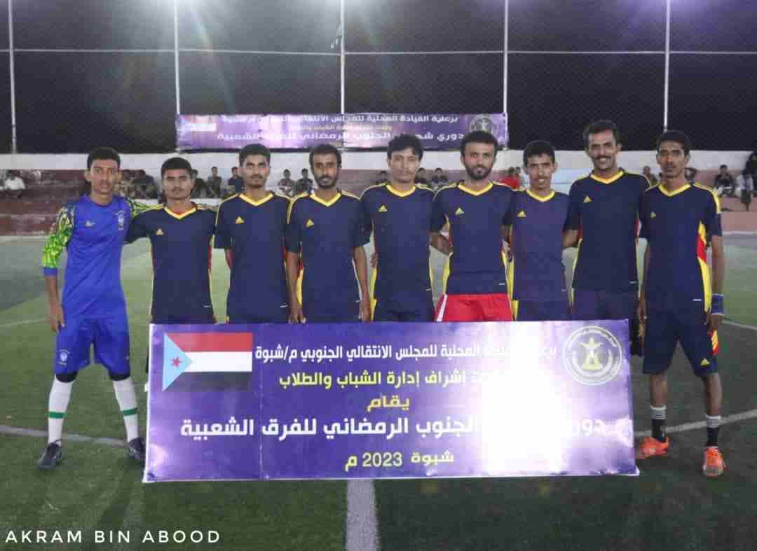 برعاية القيادة المحلية للمجلس الانتقالي الجنوبي م/ شبوة، وتحت إشراف دائرة الشباب والطلاب بتنفيذية انتقالي شبوة، استمرت مساء الأمس السبت على ملعب ذيبان إسباير، مباريات دوري شهداء الجنوب الرمضاني، بإقامة مبارتين في الأولى تغلب شمسان على الصديق بثلاثة أهداف نظيفة، وفي الثانية فاز شعب شبوة على العمالق نصاب بهدفين لهدف. وفي المباراة الأولى افتتح محمد جلال النتيجة لفريقه شمسان بهدف في مرمى الصديق، ليعزز بعدها زميله مرتضى خالد النتيجة برأسية في مرمى الصديق لينتهي عليه الشوط الأول، وفي الشوط الثاني ضاعف لاعب شمسان الكابتن عبدالقادر عمر النتيجة بثالث الأهداف، ليؤكد على فوز وصدارة فريقه بثلاثة أهداف مقابل لاشيئ. وفي المباراة الثانية تقدم وهيب بامدوخ بهدف السبق لفريقه شعب شبوة، إلا أن عمالق نصاب أدرك التعادل عن طريق صالح عبدالله في الشوط الأول، وفي الشوط الثاني خطف بكري أحمد لاعب شعب شبوة هدف الفوز لصالح فريقه في مرمى عمالق نصاب. أدار المباراتين الحكم علي دبيان، وراقبها الأخ محمد القفان. يلعب اليوم الأحد ضمن البطولة مباراتين تجمع كلاً من الأولى بين الغيث العبداني مع الجيش، والثانية الأحرار مع لهمان مرخة.