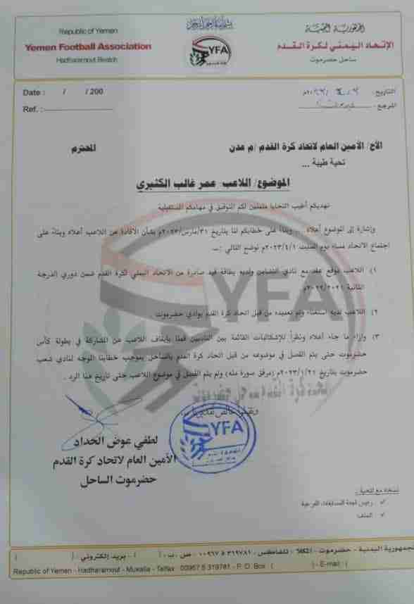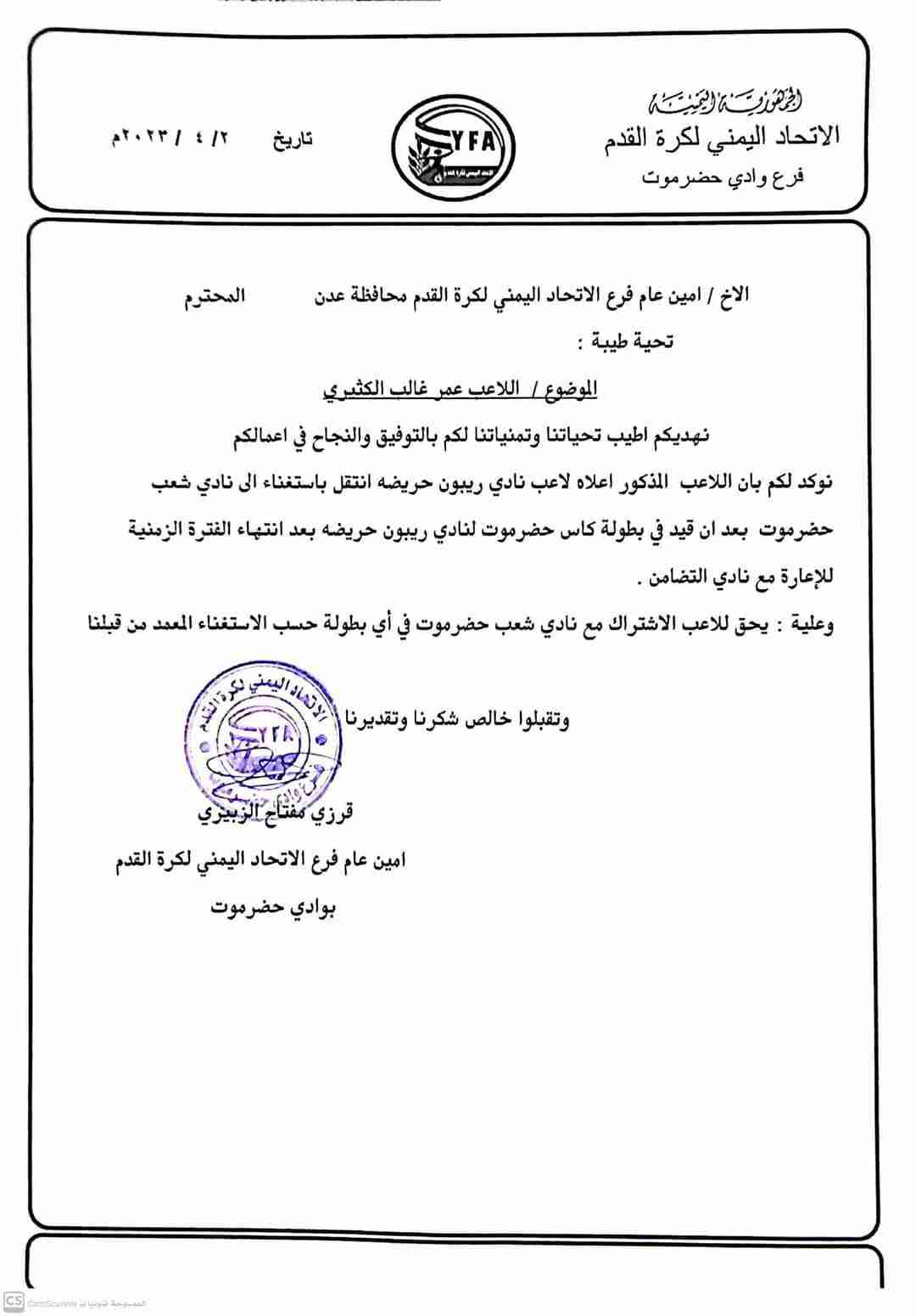 بيان صادر من إدارة نادي شعب حضرموت بخصوص قضية اللاعب عمر الكثيري