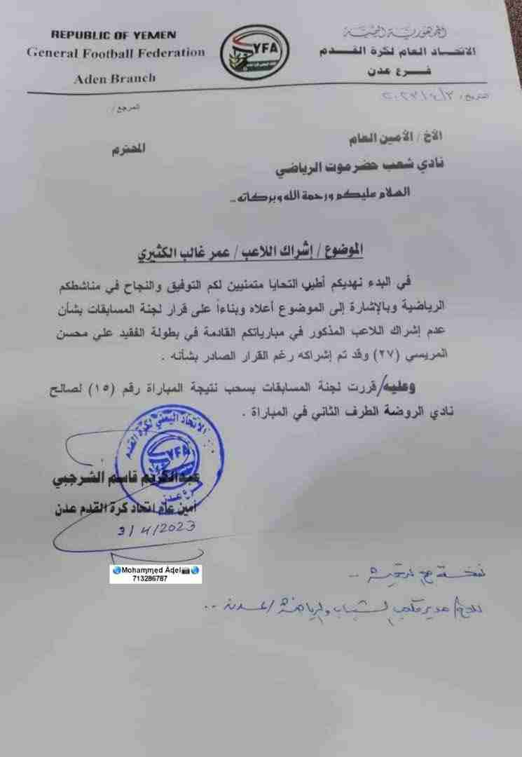. نتيجة لما شهده الشارع الرياضي من تباين في الآراء حول قضية اللاعب عمر غالب الكثيري ،واحقية أي من الناديين شعب حضرموت والتضامن في اللاعب . نود نوضح لجماهير نادينا والشارع الرياضي عامة مايلي : 1-نادينا يملك استغناء رسمي من نادي ريبون حريضة ومعمد من فرع اتحاد الوادي ،وهو الاتحاد الشرعي من قبل الاتحاد العام والمعترف به والمسؤول على شؤون أندية الوادي ،وبعد أن انتهت فترة إعارته لنادي التضامن ،عاد اللاعب لناديه الاصلي ريبون حريضة ثم انتقل باستغناء رسمي إلى نادي شعب حضرموت. 2-اصدر فرع اتحاد كرة القدم بالساحل بيان يقول فيه؛ أنه لم يكن طرف في دوري المريسي كما يعلم الجميع ،وبما انه لم يكن طرف في هذه البطوله وهي بطولة المريسى لا يحق له ايقاف او اشراك اي لاعب ولم يتدخل في قضية اللاعب الكثيري بما يخص مشاركة في دوري المريسي مع نادي شعب حضرموت. لكن نتفاجأ اليوم برسالة من امين عام فرع الساحل يؤكد فيها على أن اللاعب يعتبر لاعب نادي التضامن ، في تناقض واضح وفاضح من قبل فرع الساحل ،يبين مدى التآمر الواضح على نادينا ،وخرقا للائحة المسابقات المعتمدة من قبل الاتحاد العام لكرة القدم. حيث أن نادي التضامن ليس لديه استغناء من ناديه بعد انتهاء إعارته ، وانما نادي شعب حضرموت هو من يملك إخلاء طرف اللاعب من نادي ريبون واللاعب يعتبر لاعبه بموجب الاستغناء الرسمي من ناديه الأصلي ريبون حريضه والمعمد من فرع اتحاد الوادي في تاريخه وبموجب اللوائح والقوانين واستنادا للائحة لجنة المسابقات الجديدة 2022/2021م المعتمدة من الاتحاد العام لكرة القدم ولجنة المسابقات العليا وأن أي لائحه قبل ذلك تعتبر لاغية. كما أننا هنا نطرح سؤالا على فرع اتحاد كرة القدم بعدن ،لماذا اعتمدتوا رسالة فرع الساحل وعلى ضوئها اتخذتم القرار بسحب نتيجة المباراة لصالح نادي الروضة ،بينما لم تعتمدوا رسالة فرع الوادي ،وهو الفرع المخول بالفصل في هذا الأمر كونه الاتحاد الشرعي والمعترف به من قبل الاتحاد العام ،على الرغم من عدم شرعية اتحاد الساحل والغير معترف به حتى الآن من قبل الاتحاد العام لكرة القدم. 3-نحن في إدارة نادي شعب حضرموت لن نسكت على هذا الإجراء التعسفي الظالم من قبل فرع اتحاد كرة القدم بالساحل ضد نادينا ،وسنصعد الأمر للاتحاد العام ولأعلى المستويات ،كما أننا نطالب رئيس الاتحاد العام لكرة القدم والامين العام ،بوضع حد لتصرفات وعبث اتحاد الساحل ،الذي يقوم بخرق اللوائح والقوانين وتفصيلها بما يناسب أندية بعينها على حساب أندية أخرى . ولهذا فإننا ومن اليوم نعلن مقاطعتنا لأي نشاط يشرف عليه فرع اتحاد كرة القدم بساحل حضرموت على مستوى كل الفئات ،حتى يتم انصافنا من الاتحاد اليمني العام لكرة القدم. وإنا سائرون في طريق استخراج حقوقنا بكل ما أُوتينا من قوة وبحسب اللوائح والقوانين التي أقرتها لجنة المسابقات بالاتحاد العام لكرة القدم. والله ولي التوفيق . الامين العام لنادي شعب حضرموت صالح عمر السعدي