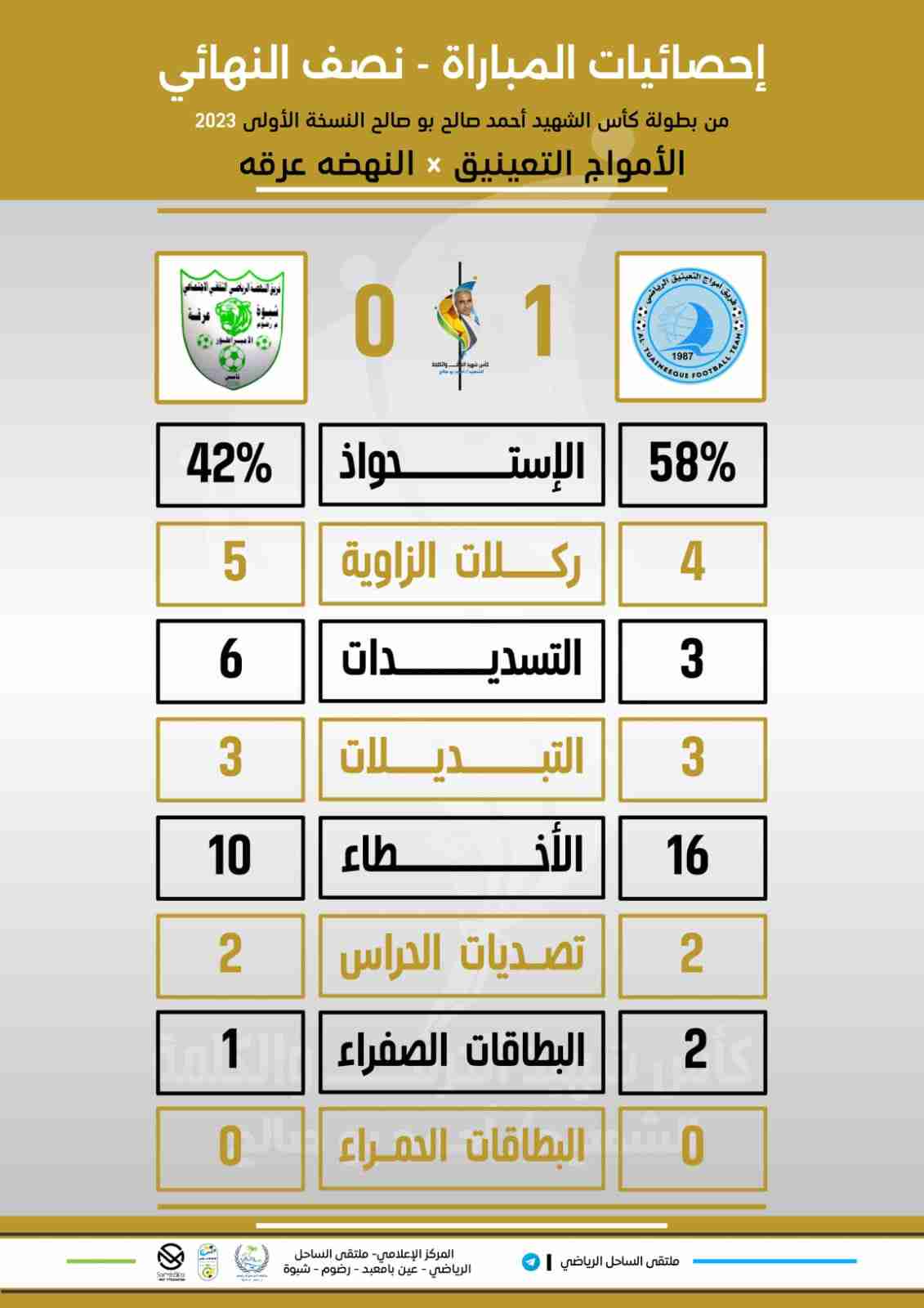 في ثاني مباريات دور الكبار ومربع الذهب في بطولة كأس شهيد الحرف والكلمة الشهيد أحمد بو صالح النسخه الأولى للعام 2023م، والتي تقام برعاية كريمة من المجلس الإنتقالي الجنوبي بمحافظة شبوة وبإشراف مباشر من إدارة الشباب والطلاب في المجلس وتنظيم أكثر من رائع من ملتقى الساحل الرياضي بمديرية رضوم في محافظة شبوة وكان ملعب عين بامعبد الشهير حاضناً للقاء النظيرين أمواج التعينيق ونهضة عرقة في المباراة المفصلية التي كسب رهانها الأمواج بهدف نظيف. كالعادة انطلقت صافرة البداية من الحكم المتميز والرائع ماجد سبيت والتي تسفر عن أحداث ومجريات وفعاليات الشوط الأول من لقاء النهضة ونظيره الامواج، فكانت البداية قوية للنهضة الذي أراد أن يسيطر على مجريات المباراة مبكراً ورمي أول سهامه الهجومية عن طريق الرائع مهدي عبدالشاخ الذي كاد أن يدوّن أول أهداف اللقاء لولا براعة حارس مرمى الأمواج معاذ سالم. فيما استفاق رفاق عماد البراكي بعد تسديدة اللاعب موسى لعوش وتصدي خرافي من حارس مرمى النهضة المردوف ولكن كم كان اللاعب زكريا سرده محظوظاً عندما عادت اليه الكوره مجدداً لم يتأنى في وضعها في شبكة النهضاوية ليحرز أول أهداف المباراة في الدقيقة السادسة عشر. لم يستسلم النهضة وعاد الكرّة مجدداً عن طريق المكير مهدي عبدالشاخ بتسديدة قوية اخرجها اللاعب عبد الحكيم البراكي من كرش الحوت بطريقة عجيبة لينتهي شوط المباراة الأول بتقدم الأمواج بهدف نظيف. أما عن أحداث مجريات الشوط الثاني، فقد القى مدرب النهضة عبدالحميد قعنون كل اوراقه مندفعاً نحو الهجوم بغية الرجوع في النتيجة من عدة محاولات أبرزها كانت عن طريق المكير عبدالشاخ عندما أهدى زميله محمد مزاحم راسية خطيره لم يحسن التعامل معها بالشكل المطلوب. فيما نجح مدرب الأمواج بسام قروان في المحافظة على النتيجة دون التهور والاندفاع إلى مرمى الخصم الذي يحاول بكل ما اوتي من قوة بتعديل الكفّة، ولكن جميع محاولات النهضاوية بائت بالفشل ووجدت دفاع الأمواج الصلب الذي تفنن في إبطال كل تلك المحاولات النهضاوية الخطيرة، بعدها بدقائق أعلن حكم الساحه بن سبيت عن نهاية اللقاء بفوز الأمواج بهدف وحيد على نظيره النهضة ليجد نفسه طرفاً في النهائي أمام نظيره الطامح السد من بطولة كأس شهيد الحرف والكلمة الشهيد أحمد بوصالح النسخة الاولى للعام 2023م _أدار اللقاء تحكيماً كلاً من: ماجد سبيت حكم ساحة وساعده في الخطوط كلاً من رائد محبوب وأحمد طاهر ومبارك ياسر حكماً رابعاً. _ *جائزة أفضل لاعب تحصل عليها لاعب فريق الامواج عماد البراكي* المركز الإعلامي لملتقى الساحل الرياضي _عين بامعبد _رضوم _ شبوة