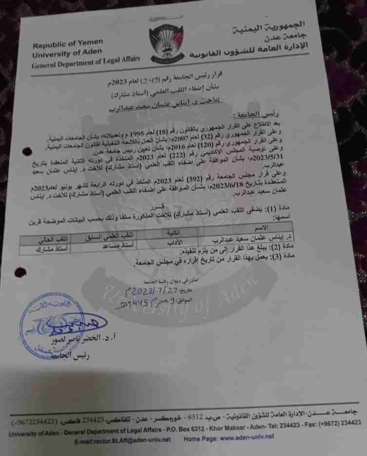 نالت الدكتورة إيناس عثمان سعيد عبدالرب. اللقب العلمي استاذ مشارك. بعد أن أصدر رئيس جامعة عدن قرار رقم (249) لعام 2023م، قضى باضافة اللقب العلمي أستاذ مشارك للدكتور إيناس عثمان سعيد عبدالرب. وجاء في القرار : مادة (1): يضفي اللقب العلمي (أستاذ مشارك) للدكتورة إيناس عثمان سعيد عبدالرب. مادة (2): يبلغ هذا القرار إلى من يلزم تنفيذه. مادة (3): يعمل بهذا القرار من تاريخ إقراره في مجلس جامعة عدن.