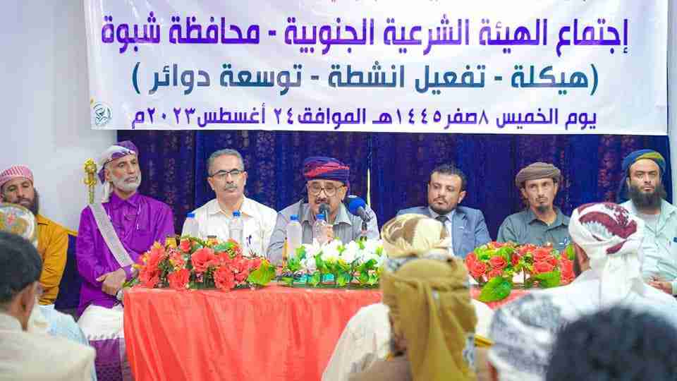 تعرف على قيادة الهيئة الشرعية الجنوبية بشبوة شبوة / خاص الخميس 24 اغسطس2023 برعاية الرئيس القائد عيدروس قاسم الزبيدي رئيس المجلس الانتقالي الجنوبي وتحت شعار (هيكلة، تفعيل أنشطة، توسعة دوائر) عقدت الهيئة الشرعية الجنوبية في محافظة/شبوة أجتماعا لها صباح اليوم الخميس في قاعة مركز الشاعر يسلم بن علي الثقافي بعاصمة المحافظة عتق، بحضور رئيس الهيئة التنفيذية للمجلس الانتقالي بالمحافظة الاستاذ عبدالعزيز بن لكسر ووكيل المحافظة الاستاذ فهد سالم الطوسلي والشيخ علي محسن السليماني رئيس اللجنة التحضيرية للهيئة الشرعية الجنوبية بالمحافظة والشيخ/محسن محمد مجرح مدير عام مكتب الاوقاف بالمحافظة والاستاذ عبدالله صالح العمياء مدير عام مديرية عتق وعدد آخر من الشخصيات الاجتماعية . و بدأ الاجتماع بآيات من الذكر الحكيم ثم كلمه لرئيس اللجنة التحضيرية الشيخ علي محسن السليماني نقل من خلالها تحيات الرئيس/عيدروس قاسم الزبيدي رئيس المجلس الانتقالي الجنوبي نائب رئيس مجلس القيادة الرئاسي ، مرحبا فيها بالضيوف واعضاء الهيئة الشرعية ، متحدثا عن ""اهمية هذا اللقاء والذي يعقد تحت رعاية الاخ الرئيس القائد عيدروس قاسم الزبيدي، والذي يولي هذا الجانب الاهتمام والرعاية لكونه الركيزة الاساسية لبناء المجتمع وتنويره وايضاح الشبهات والتحذير من الفتن والآفات الضارة بالمجتمع"". وحث الشيخ السليماني الاعضاء على القيام بدورهم في الدعوه إلى الله ونبذ الخلافات والتحذير من كل مايحاك من قبل الاعداء ضد أمتنا العربية والاسلامية ، والعمل بروح الفريق الواحد لايصال رسالة الاسلام الوسطية بعيداً عن الغلو والتطرف، لافتا إلى أهمية تفعيل عمل الهيئة الشرعية الجنوبية بالمحافظة بحيث ترتكز على قاعدة تنظيمية صلبة من العمل المؤسسي الذي يسهم في إنجاح الأهداف والخطط المرسومة ، مضيفا أن الهيئة سترحب بكل الدعاة والعلماء للالتحاق بها لما فيه خدمة الدعوة . وفي كلمة رئيس الهيئة التنفيذية للمجلس الانتقالي بالمحافظة شبوة الاستاذ عبدالعزيز بن لكسر نقل في البداية تحيات القيادة السياسية ممثلة بالرئيس عيدروس قاسم الزبيدي للمجتمعين ، متطرقا إلى الدور الهام للهيئة الشرعية الجنوبية ودورها الكبير في نشر تعاليم الوسطية في ديننا الاسلامي التي تحث على القيم والسلام والتسامح والرحمة وتهذيب النفس بعيداً عن الغلو والتطرف والتعصب، مضيفا ""ان ابناء هذه الارض المباركة قد قاموا بنشر الاسلام بالاخلاق والمعاملة الطيبة والامانة والمصداقية وحب العمل فقدموا افضل نموذج للانسان السوي الذي يحب الناس ويقدم لهم العون والمساعده ، والتعامل معهم بصدق كما نشاهد في دول المهجر التي رحل له ابناء الجنوب في شرق اسيا وافريقيا "". وأكد بن لكسر على ضرورة استعادة الوسطية والاعتدال والقيم الاصيلة من خلال الخطاب الديني الرصين والملتزم بحجم المخاطر التي تتربص بمستقبل اجيالنا ، مشددا على نصرة المظلوم وحب العلم والعمل واحترام النظام ورفض الفوضئ والتطرف والارهاب. ونقل وكيل محافظة شبوة الاستاذ فهد سالم الطوسلي في كلمته تحيات الشيخ عوض محمد بن الوزير محافظ محافظة شبوة ومباركته لتشكيل الهيئة الشرعية الجنوبية ، داعيا اعضاء الهيئة الشرعية للاطلاع بمهامهم وتوعية المجتمع وتحصينه من الظواهر الدخيلة، وكذا مساعدة السلطة المحليه في القضاء على آفة الثار واصلاح ذات البين ونبذ التفرقة والخلافات وتوعية الشباب بامور دينهم وحثهم على الاخلاق الحميده التي امرنا بها ديننا الحنيف. كما القى الاخ مدير عام مكتب الاوقاف بالمحافظة الشيخ محسن محمد بن مجرح كلمة شكر من خلالها القيادة السياسيه ممثلة بالرئيس عيدروس قاسم الزبيدي والشيخ عوض بن الوزير محافظ محافظة شبوة لدعمهم الدعوة والدعاة، موضحا ""هذه لفتة كريمه من القيادة التي استشعرت اهمية نشر الدين الحنيف وان الدعاة بحاجه للدعم لنشر الوعي والدعوة الى الله لمحاربة الفكر الرافضي والخوارج، وليعلم الجميع اهمية دور المساجد و