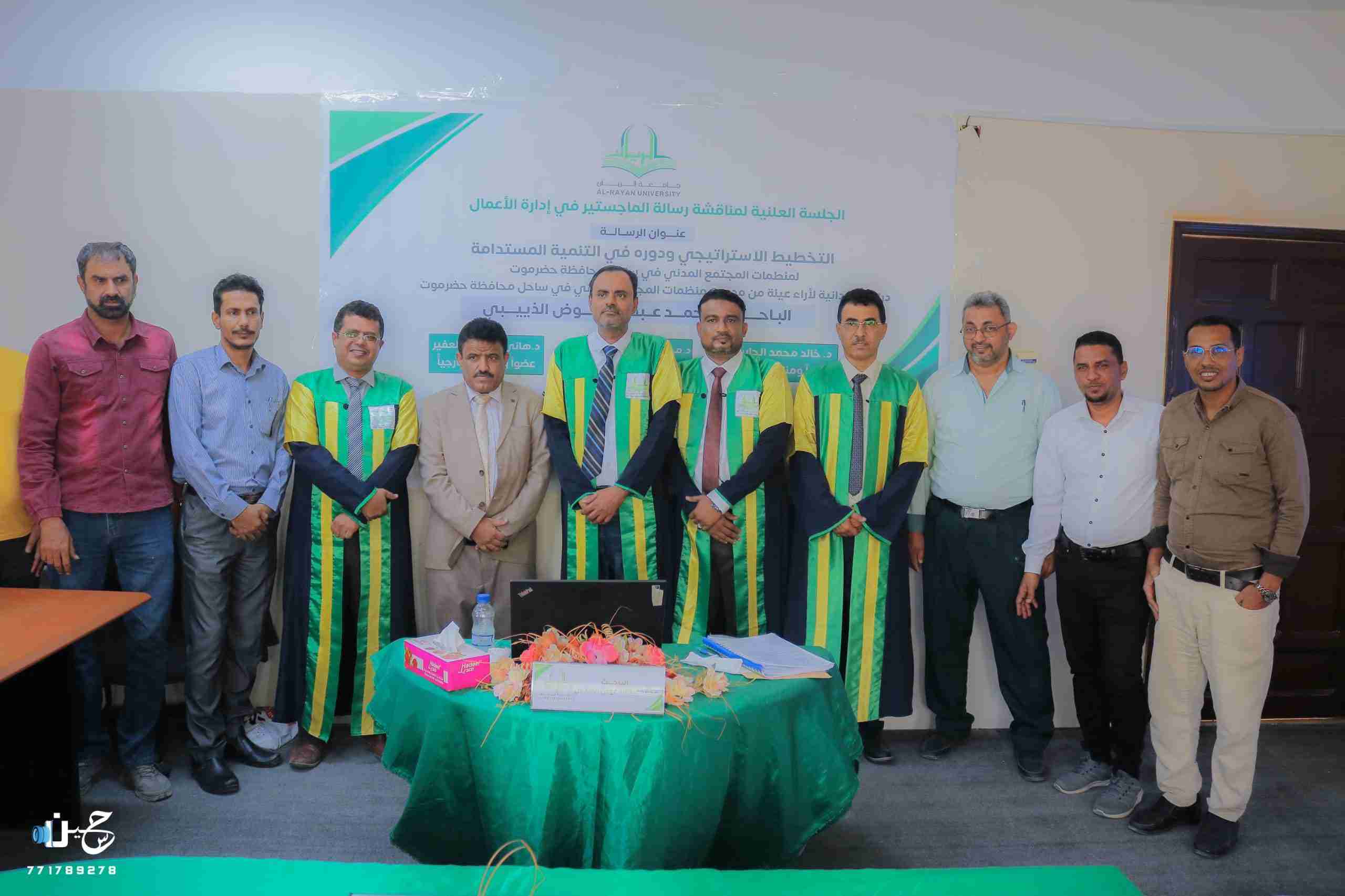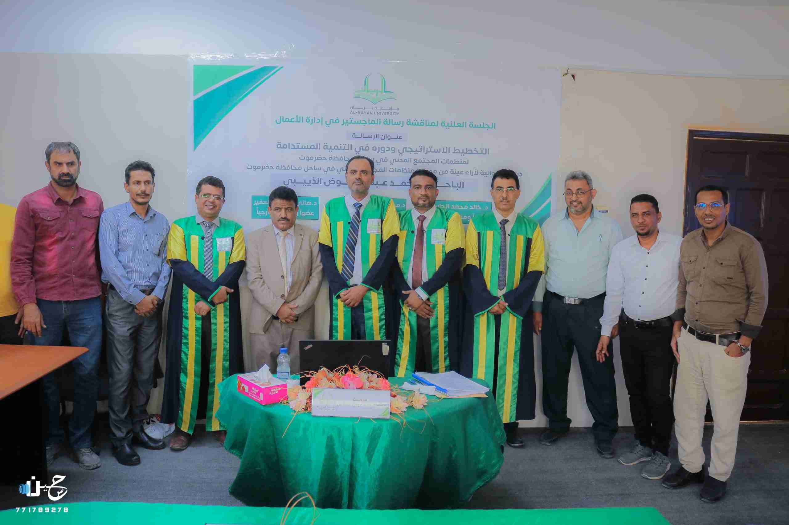 المكلا | حسين عمر بازنبور الإثنين | 30 أكتوبر | 2023م نوقشت صباح اليوم بجامعة الريان الجلسة العلنية لرسالة الماجستير للباحث محمد عبدالله الذييبي في إدارة الأعمال، والموسومة بالتخطيط الاستراتيجي ودوره في التنمية المستدامة لمنظمات المجتمع المدني في ساحل محافظة حضرموت، والتي تُمثّل دراسة ميدانية لآراء عيّنة من مديري منظمات المجتمع المدني في ساحل محافظة حضرموت. وتكوّنت لجنة المناقشة من الدكتور هاني سالمين بلعفير كعضو ومناقش خارجي والدكتور محسن محمد بن كليب كرئيسا ومشرفا علميا والدكتور خالد محمد الجابري كعضوا ومناقشا داخليا، والذين أبدوا رأيهم ومجموعة من الملاحظات التي تصوّب عمل الباحث وتعزز قيمة الرسالة وذلك بعد الاستماع للرسالة من قِبل الباحث. وفي الآخير وبعد تقديم المشرفين لمجموعة من الملاحظات والتوصيات الهادفة لتطوير مضمون الرساله،تم اعلان النتيجة النهائية لجلسة المناقشة والتي أُعلنت بإعطاء الباحث درجة الماجستير بإمتياز من جامعة الريان بالمكلا،وسط حضور ومشاركة وفرحة من قِبل أهالي وأصدقاء الباحث. في السياق ذاته هنأ مدير الصندوق الاجتماعي للتنمية فرع المكلا الدكتور عوض سالم لقصم وجميع منتسبي الفرع الباحث على نيله درجة الماجستير والذي يشغل وظيفة الضابط المجتمعي لبرنامج النقد مفابل العمل بفرع المكلا، متمنين له دوام التوفيق والنجاح في مشواره وتحصيله العلمي ومهامه العملية بالفرع.نوقشت صباح اليوم بجامعة الريان الجلسة العلنية لرسالة الماجستير للباحث محمد عبدالله الذييبي في إدارة الأعمال، والموسومة بالتخطيط الاستراتيجي ودوره في التنمية المستدامة لمنظمات المجتمع المدني في ساحل محافظة حضرموت، والتي تُمثّل دراسة ميدانية لآراء عيّنة من مديري منظمات المجتمع المدني في ساحل محافظة حضرموت. وتكوّنت لجنة المناقشة من الدكتور هاني سالمين بلعفير كعضو ومناقش خارجي والدكتور محسن محمد بن كليب كرئيسا ومشرفا علميا والدكتور خالد محمد الجابري كعضوا ومناقشا داخليا، والذين أبدوا رأيهم ومجموعة من الملاحظات التي تصوّب عمل الباحث وتعزز قيمة الرسالة وذلك بعد الاستماع للرسالة من قِبل الباحث. وفي الآخير وبعد تقديم المشرفين لمجموعة من الملاحظات والتوصيات الهادفة لتطوير مضمون الرساله،تم اعلان النتيجة النهائية لجلسة المناقشة والتي أُعلنت بإعطاء الباحث درجة الماجستير بإمتياز من جامعة الريان بالمكلا،وسط حضور ومشاركة وفرحة من قِبل أهالي وأصدقاء الباحث. في السياق ذاته هنأ مدير الصندوق الاجتماعي للتنمية فرع المكلا الدكتور عوض سالم لقصم وجميع منتسبي الفرع الباحث على نيله درجة الماجستير والذي يشغل وظيفة الضابط المجتمعي لبرنامج النقد مفابل العمل بفرع المكلا، متمنين له دوام التوفيق والنجاح في مشواره وتحصيله العلمي ومهامه العملية بالفرع.