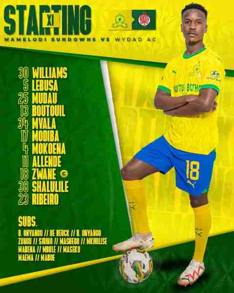 وسيبدأ المدير الفني لنادي ماميلودي صن داونز الجنوب إفريقي، رولاني موكوينا (36 عاما) بالتشكيلة الأساسية التالية لمواجهة ضيفه المغربي: