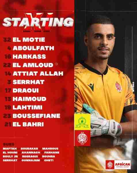 بينما اختار المدير الفني لنادي الوداد الرياضي المغربي، عادل رمزي (46 عاما) التشكيلة الأساسية التالية لمواجهة مضيفه الجنوب إفريقي:
