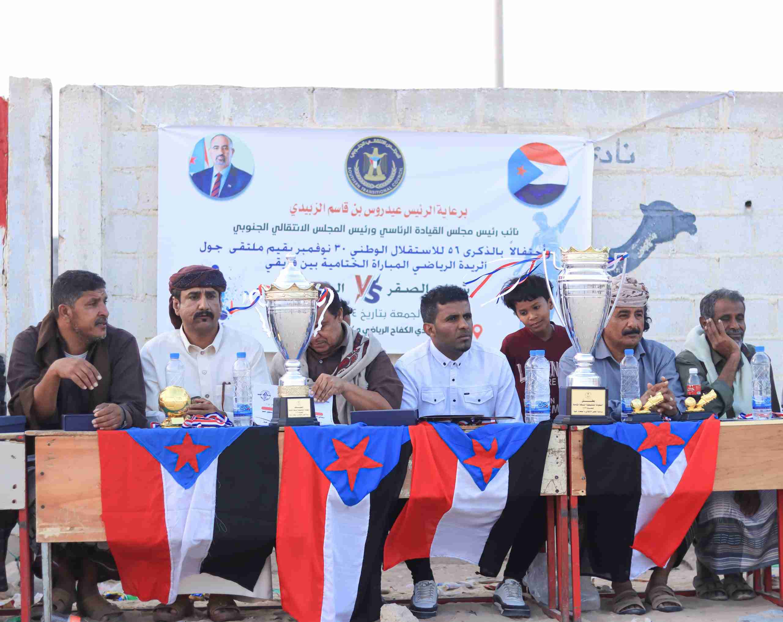 بحضور أ.عبدالرحمن الحرملي مدير إدارة الشباب والرياضة في المجلس الإنتقالي الجنوبي م/شبوة، و أ.صالح باديان رئيس تنفيذية أنتقالي مديرية ميفعة، وأ.محمد احمد باعوضه عضو المجلس الاستشاري م/شبوة، وأعضاء القيادة المحلية للمجلس الإنتقالي الجنوبي م/شبوة أ.عبدالسلام الاحمدي، وأ.صالح بامعيلا، وأ.مكاوي الجعب، وأ. انور بوشمل مدير إدارة الشباب والرياضة بانتقالي مديرية ميفعه وجمعاً غفير من الجماهير والشخصيات الاجتماعية والرياضية بمحافظة شبوة توج فريق شباب الصقر ببطولة الدوري التنشيطي النسخة "8"، للفرق الشعبية بملتقى جول الريدة بعد فوزه على اليمداء بركلات الترجيح بركلات الترجيح بعد انتهاء الوقت الأصلي بالتعادل الإيجابي بهدفين لهدفين في المباراة النهائية التي جمعتهم عصر اليوم على أرضية ملعب نادي الكفاح بمديرية ميفعه وأقيمت البطولة برعاية القيادة المحلية للمجلس الإنتقالي الجنوبي م/شبوة، تحت إشراف القيادة المحلية للمجلس الإنتقالي الجنوبي بمديرية ميفعه، وتنظيم ملتقى جول الريده وتقدم فريق اليمداء في منتصف شوط اللقاء الاول عن طريق لاعبه علي راشد، قبل أن يتمكن عبدالله يماني من احراز هدف التعديل لشباب الصقر من راسيه جميلة قبل انتهاء مجريات الشوط الأول بدقائق ليطلق بعدها حكم المباراة صافرة نهاية الشوط الأول بالتعادل الإيجابي بهدف لهدف وفي الشوط اللقاء الثاني أستطاع عبدالله يماني من تعزيز النتيجة لصالح شباب الصقر بتسجيلة الهدف الثاني، وبينما المباراة تلفظ أنفاسها الاخيرة تحصل اليمداء على ركلة جزاء نفذها احمد عبدوه بنجاح وإعاد اليمداء الى اجواء المباراة واستمرت المباراة على حالها حتى انهى الحكم اللقاء بالتعادل الإيجابي بهدفين لهدفين، ليلجأ الفريقين الى ركلات الترجيح والتي أبتسمت لمصلحة شباب الصقر بنتيجة 4-3، ليتوج شباب الصقر بطلاً للبطولة وفي الختام قام الحاضرون يتقدمهم أ.عبدالرحمن الحرملي، وأ.صالح باديان بتسليم جوائز البطولة حيث حصل اللاعب ياسر لبيض على جائزة افضل لاعب في البطولة، وحصل اللاعب ناجي عاطف على جائزة هداف البطولة، ونال عبدالعزيز الخشيم جائزة أفضل حارس في البطولة، واللاعب علي راشد أفضل لاعب محترف، واللاعب صامد بن صويلح أفضل لاعب صاعد، وحصل مدرب فريق شباب الصقر علي سعيد الزبيدي على جائزة أفضل مدرب في البطولة، وفريق اليمداء بكأس الوصيف والميداليات الفضية، وفريق شباب الصقر بكأس البطل والميداليات الذهبية.