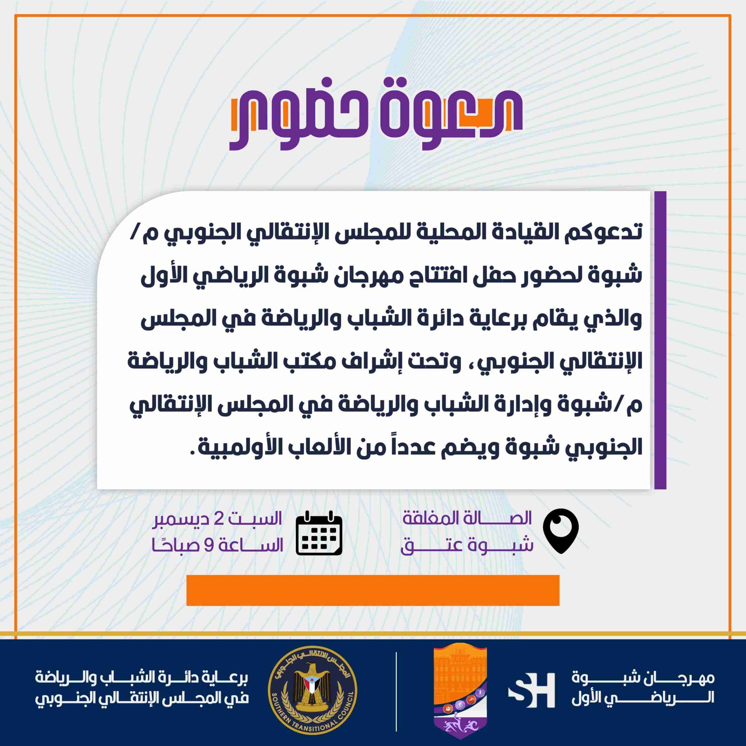 غداً : دائرة الشباب والرياضة بالمجلس الانتقالي تدعو كافة الشباب والرياضيين لحضور حفل إفتتاح مهرجان شبوة الرياضي الأول