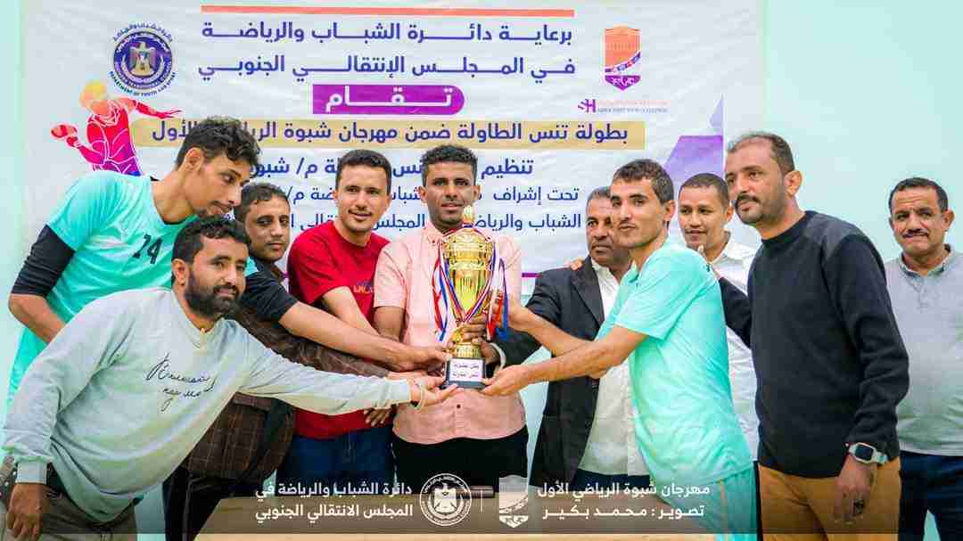 نادي شباب المصينعه يتوج بطلاً لبطولة تنس الطاولة للأندية والصمود وصيفاً شبوة - إعلام البطولة الاحد 3 ديسمبر 2023 توج نادي شباب المصينعه بطلاً للبطولة الفردية لكرة الطاولة للاعبي اندية محافظة شبوة، وحل الصمود الصعيد وصيفاً في البطولة التي أقيمت صباح اليوم الأحد ضمن مهرجان شبوة الرياضي الأول الذي ترعاه دائرة الشباب والرياضة في المجلس الإنتقالي الجنوبي، تحت إشراف مكتب الشباب والرياضة م/شبوة، وإدارة الشباب والرياضة في المجلس الإنتقالي الجنوبي شبوة وشارك في البطولة التي احتضنتها صالة الفقيد عادل الأعسم للألعاب الرياضية في العاصمة عتق، ونظمها اتحاد تنس الطاولة فرع شبوة 20 لاعباً يمثلون أندية شباب المصينعه، صمود الصعيد، التضامن شبوة، الكفاح ميفعه، ريدان بيحان، اتحاد جردان، الشاطى بئر علي، المجد هدى، شباب عبدان، وكلية الأدارة والأقتصاد وجاء نتائج مباريات البطولة على النحو التالي : -فوز ريدان بيحان على المجد هدى (3-0) -فوز شباب المصينعه على التضامن (3-0) -فوز صمود الصعيد علئ كلية الادارة والاقتصاد (3-0) - فوز اتحاد جردان على الشاطى بئر علي (3-0) - فوز شباب عبدان على الكفاح ميفعه (3-0) - فوز شباب المصينعه على ريدان بيحان (3-0) - فوز الصمود على شباب عبدان (3-0) - فوز الصمود على اتحاد جردان (3-0) - فوز شباب المصينعه على الصمود (3-2) وفي الختام كرم الحاضرين يتقدمهم مدير ادارة الشباب والرياضة في المجلس الإنتقالي الجنوبي شبوة عبدالرحمن الحرملي، ورئيس اللجنة المنظمة الخضر بوجليده، ورئيس اتحاد كرة تنس الطاولة فرع شبوة انور سعيد، و امين عام اتحاد كرة تنس الطاولة صلاح باوزير، والمسؤول المالي في اتحاد الشطرنج ماجد الجوفي وعضو اللجنة المنظمة نايف جحشان فريق الصمود بكأس الوصيف و الميداليات الفضية، وفريق الصمود بكأس البطل والميداليات الذهبية وتستمر منافسات فعاليات مهرجان شبوة الرياضي الأول في كرة الطائرة عصر اليوم بلقاء يجمع الصمود الصعيد وريدان بيحان.توج نادي شباب المصينعه بطلاً للبطولة الفردية لكرة الطاولة للاعبي اندية محافظة شبوة، وحل الصمود الصعيد وصيفاً في البطولة التي أقيمت صباح اليوم الأحد ضمن مهرجان شبوة الرياضي الأول الذي ترعاه دائرة الشباب والرياضة في المجلس الإنتقالي الجنوبي، تحت إشراف مكتب الشباب والرياضة م/شبوة، وإدارة الشباب والرياضة في المجلس الإنتقالي الجنوبي شبوة وشارك في البطولة التي احتضنتها صالة الفقيد عادل الأعسم للألعاب الرياضية في العاصمة عتق، ونظمها اتحاد تنس الطاولة فرع شبوة 20 لاعباً يمثلون أندية شباب المصينعه، صمود الصعيد، التضامن شبوة، الكفاح ميفعه، ريدان بيحان، اتحاد جردان، الشاطى بئر علي، المجد هدى، شباب عبدان، وكلية الأدارة والأقتصاد وجاء نتائج مباريات البطولة على النحو التالي : -فوز ريدان بيحان على المجد هدى (3-0) -فوز شباب المصينعه على التضامن (3-0) -فوز صمود الصعيد علئ كلية الادارة والاقتصاد (3-0) - فوز اتحاد جردان على الشاطى بئر علي (3-0) - فوز شباب عبدان على الكفاح ميفعه (3-0) - فوز شباب المصينعه على ريدان بيحان (3-0) - فوز الصمود على شباب عبدان (3-0) - فوز الصمود على اتحاد جردان (3-0) - فوز شباب المصينعه على الصمود (3-2) وفي الختام كرم الحاضرين يتقدمهم مدير ادارة الشباب والرياضة في المجلس الإنتقالي الجنوبي شبوة عبدالرحمن الحرملي، ورئيس اللجنة المنظمة الخضر بوجليده، ورئيس اتحاد كرة تنس الطاولة فرع شبوة انور سعيد، و امين عام اتحاد كرة تنس الطاولة صلاح باوزير، والمسؤول المالي في اتحاد الشطرنج ماجد الجوفي وعضو اللجنة المنظمة نايف جحشان فريق الصمود بكأس الوصيف و الميداليات الفضية، وفريق الصمود بكأس البطل والميداليات الذهبية وتستمر منافسات فعاليات مهرجان شبوة الرياضي الأول في كرة الطائرة عصر اليوم بلقاء يجمع الصمود الصعيد وريدان بيحان.