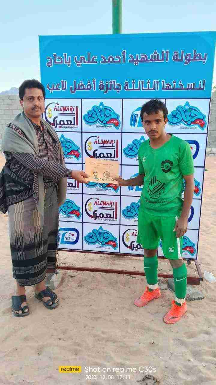 * حبان/يسلم الحفشاء : برعاية كريمة من الدكتور عبدالله العليمي عضو مجلس القيادة الرئاسي وإشراف مكتب الشباب والرياضة وفرع أتحاد كرة القدم بالمحافظة وتنظيم نادي الطليعة الرياضي بمديرية حبان ، جرت مساء اليوم الجمعة على ملعب البراح بمدينة حبان التاريخية المباراة الثامنة في بطولة الشهيد أحمد علي باحاج بين ناديي شاطئ بئر علي وشباب المصينعة لحساب المجموعة الرابعة حيث تميزت المباراة بالندية والإثارة ، حقق فيها شباب المصينعة الفوز وكسب ثلاث نقاط متساويا مع نادي تمنى عسيلان في صدارة المجموعة بإنتظار المباراة الأخيرة والفاصلة بين الشاطئ وتمنى ، فعند الدقيقة 29 أحرز نجم المباراة حارث أبو حربة هدف السبق لناديه شباب المصينعة والذي به انتهت أحداث الشوط الأول . وفي الشوط الثاني حاول الشاطئ العودة إلى المباراة ولكن كل محاولاته باءت بالفشل ، ليعود نفس اللاعب الشبابي حارث أبو حربة ويسجل الهدف الثاني له ولناديه عند الدقيقة 58 ، بعدها حاول لاعبو الشاطئ تقليص الفارق وتحقق ذلك عند الدقيقة 72 عندما سجل مدافع شباب المصينعة بالخطأ في مرماه هدف تقليص الفارق ، لتنتهي المباراة بفوز شباب المصينعة على شاطئ بئر علي بهدفين مقابل هدف وبذلك يقف شباب المصينعة على شاطئ بئر علي بإنتظار اللقاء الأخير بين نادي تمنى و نادي الشاطئ لتحديد هوية المتاهل إلى المربع الذهبي عن المجموعة الرابعة . ادار المباراة تحكيمياً ناجي باهرمز في الساحة وساعده على الخطوط كلا من جلال قائد و علي طرموم وأنور قفيل رابعا فيما راقبها فنياً محمد سالمين أحمد و إدارياً علي محمد الحرملي . تحصل على جائزة أفضل لاعب في المباراة الكابتن حارث أبو حربة لاعب نادي شباب المصينعة ، قام بتسليم الجائزة الأخ أحمد عوض طعموس نائب مدير عام مكتب الضرائب لشؤون الفروع ، وهي مقدمة من مصنع مياه حبان و العمري للصرافة و مناديل حبان . كان من المقرر أن يلعب يوم غداً السبت ضمن منافسات البطولة نادي إنطلاق حطيب مع نادي شباب الحوطة في إطار المجموعة الأولى ولكن اللجنة المنظمة ألغت هذه المباراة مع مباريات أخرى كونها مباريات تحصيل حاصل . *المركز الإعلامي لبطولة باحاج3*: برعاية كريمة من الدكتور عبدالله العليمي عضو مجلس القيادة الرئاسي وإشراف مكتب الشباب والرياضة وفرع أتحاد كرة القدم بالمحافظة وتنظيم نادي الطليعة الرياضي بمديرية حبان ، جرت مساء اليوم الجمعة على ملعب البراح بمدينة حبان التاريخية المباراة الثامنة في بطولة الشهيد أحمد علي باحاج بين ناديي شاطئ بئر علي وشباب المصينعة لحساب المجموعة الرابعة حيث تميزت المباراة بالندية والإثارة ، حقق فيها شباب المصينعة الفوز وكسب ثلاث نقاط متساويا مع نادي تمنى عسيلان في صدارة المجموعة بإنتظار المباراة الأخيرة والفاصلة بين الشاطئ وتمنى ، فعند الدقيقة 29 أحرز نجم المباراة حارث أبو حربة هدف السبق لناديه شباب المصينعة والذي به انتهت أحداث الشوط الأول . وفي الشوط الثاني حاول الشاطئ العودة إلى المباراة ولكن كل محاولاته باءت بالفشل ، ليعود نفس اللاعب الشبابي حارث أبو حربة ويسجل الهدف الثاني له ولناديه عند الدقيقة 58 ، بعدها حاول لاعبو الشاطئ تقليص الفارق وتحقق ذلك عند الدقيقة 72 عندما سجل مدافع شباب المصينعة بالخطأ في مرماه هدف تقليص الفارق ، لتنتهي المباراة بفوز شباب المصينعة على شاطئ بئر علي بهدفين مقابل هدف وبذلك يقف شباب المصينعة على شاطئ بئر علي بإنتظار اللقاء الأخير بين نادي تمنى و نادي الشاطئ لتحديد هوية المتاهل إلى المربع الذهبي عن المجموعة الرابعة . ادار المباراة تحكيمياً ناجي باهرمز في الساحة وساعده على الخطوط كلا من جلال قائد و علي طرموم وأنور قفيل رابعا فيما راقبها فنياً محمد سالمين أحمد و إدارياً علي محمد الحرملي . تحصل على جائزة أفضل لاعب في المباراة الكابتن حارث أبو حربة لاعب نادي شباب المصينعة ، قام بتسليم الجائزة الأخ أحمد عوض طعموس نائب مدير عام مكتب الضرائب لشؤون الفروع ، وهي مقدمة من مصنع مياه 
