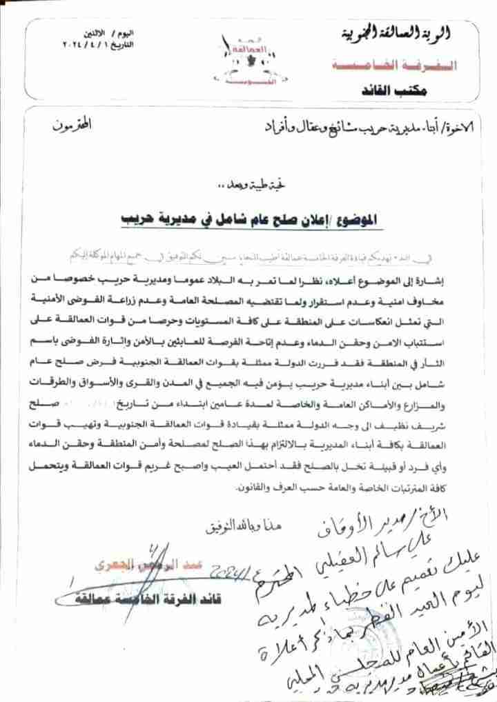 أعلنت قيادة الفرقة الخامسة عمالقة، صلحاً عاماً شاملاً في مديرية حريب بمحافظة مأرب، وذلك في خطوة تهدف إلى إنهاء الثأرات القبلية واستتباب الأمن في المنطقة. وجاء في بيان صادر عن قيادة الفرقة الخامسة أن الصلح يأتي "نظراً لما تمر به البلاد عموما ومديرية حريب خصوصا من مخاوف أمنية وعدم استقرار ولما تقتضيه المصلحة العامة وعدم زراعة الفوضى الأمنية التي تمثل انعكاسات على المنطقة على كافة المستويات". وأكد البيان أن الصلح "يؤمن فيه الجميع في المدن والقرى والأسواق والطرقات والمزارع والأماكن العامة والخاصة لمدة عامين ابتداء من تاريخ صلح شریف نظيف إلى وجه الدولة ممثلة بقيادة قوات العمالقة الجنوبية". ودعت قيادة الفرقة الخامسة "كافة أبناء المديرية بالالتزام بهذا الصلح لمصلحة وأمن المنطقة وحقن الدماء"، مضيفةً أن "أي فرد أو قبيلة تخل بالصلح فقد احتمل العيب واصبح غريم قوات العمالقة ويتحمل كافة المترتبات الخاصة والعامة حسب العرف والقانون".