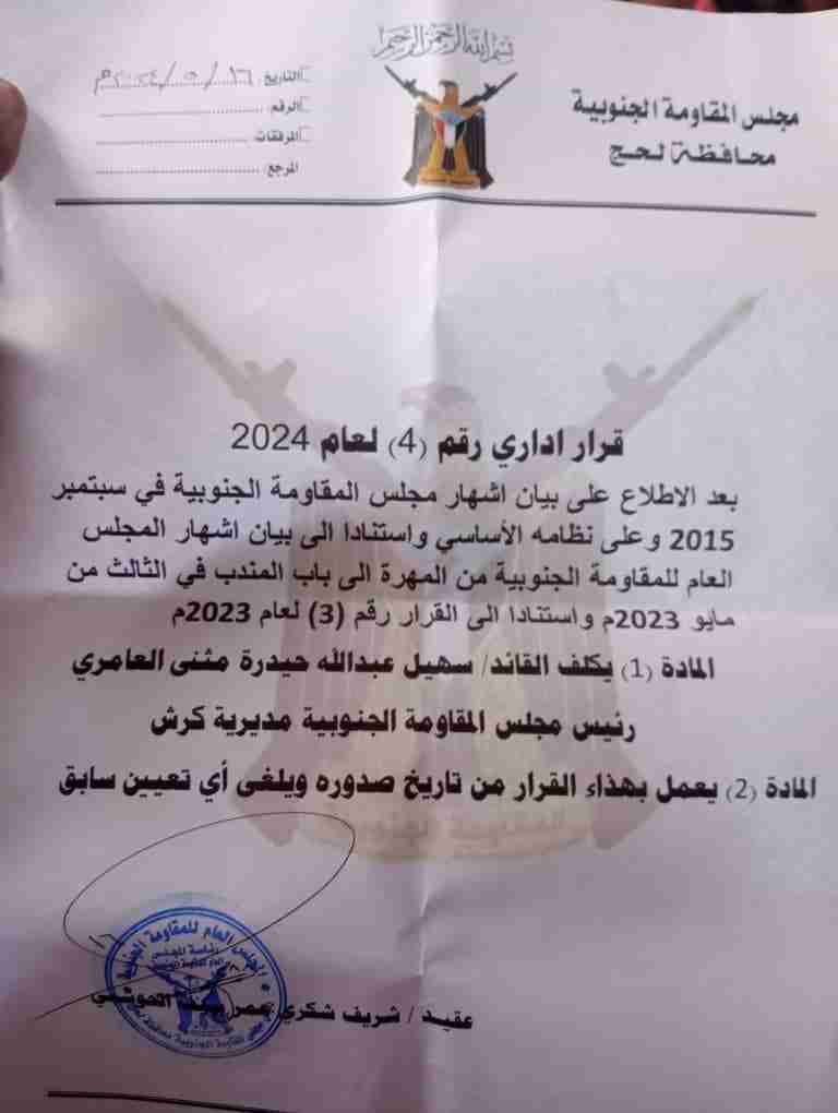 اصدرت قيادة مجلس المقاومة الجنوبية في محافظة لحج قرارا قضى بتكليف سهيل عبدالله حيدرة مثنى العامري رئيسا لمجلس المقاومة الجنوبية في كرش. وجاء في القرار: بعد الاطلاع على بيان اشهار مجلس المقاومة الجنوبية في سبتمبر 2015، وعلى نظامه الاساسي واستنادا إلى بيان اشهار المجلس العام للمقاومة الجنوبية من المهرة إلى باب المندب في الثالث من مايو 2023، واستنادا إلى القرار رقم (3) لعام 2023م. 1- يكلف القائد سهيل عبدالله حيدرة العامري، رئيسا لمجلس المقاومة الجنوبية مديرية كرش. 2- يعمل بهذا القرار من تاريخ صدوره ويلغى أي تكليف سابق.