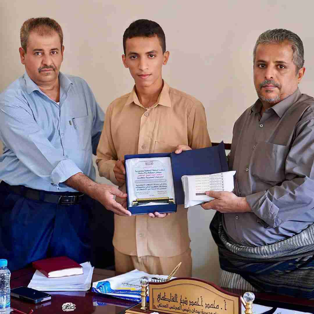 الفاطمي مدير عام بيحان والصالحي مدير التربية يكرمان بدرع الابداع ومبلغ مالي الطالب الوالي بثانوية واكد لاختراعه ريبوت متحرك وناطق