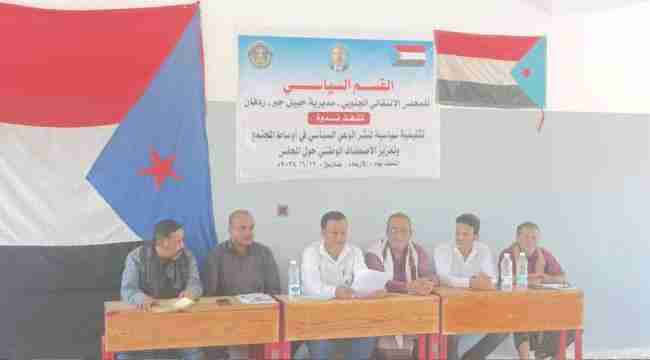 نظم القسم السياسي بالهيئة التنفيذية للقيادة المحلية للمجلس الانتقالي الجنوبي في مديرية حبيل جبر بمحافظة لحج، الأربعاء، ندوة بعنوان "نشر الوعي السياسي بين أوساط الجماهير وتعزيز الاصطفاف الوطني حول المجلس الانتقالي الجنوبي".