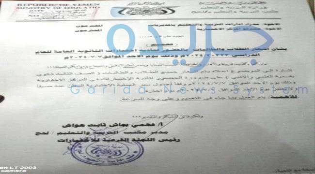 وتضمن التعميم إشعار الطلاب والطالبات المتقدمين للاختبارات الوزارية للعام الدراسي 2023/2024 بضرورة الحضور يوم الاحد المقبل الموافق 7/7/2024 إلى المراكز الاختبارية لتأدية اختباراتهم وفقا للجدول الوزاري المعد لسير العملية الاختبارية، دون أخذ إجازة.
