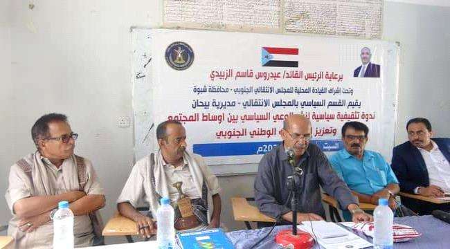 نظم القسم السياسي بالهيئة التنفيذية للقيادة المحلية بالمجلس الانتقالي الجنوبي في مديرية بيحان، بمحافظة شبوة السبت، ندوة سياسية حول تعزيز الاصطفاف الوطني حول المجلس الانتقالي، ونشر الوعي السياسي في المديرية.