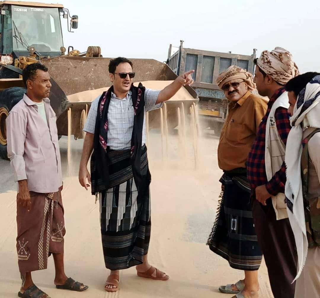 وكيل المحافظة يتفقد أعمال إزاحة الرمال المتحركة من الطريق الدولي عتق- المكلا بمنطقة النشيمه رضوم.