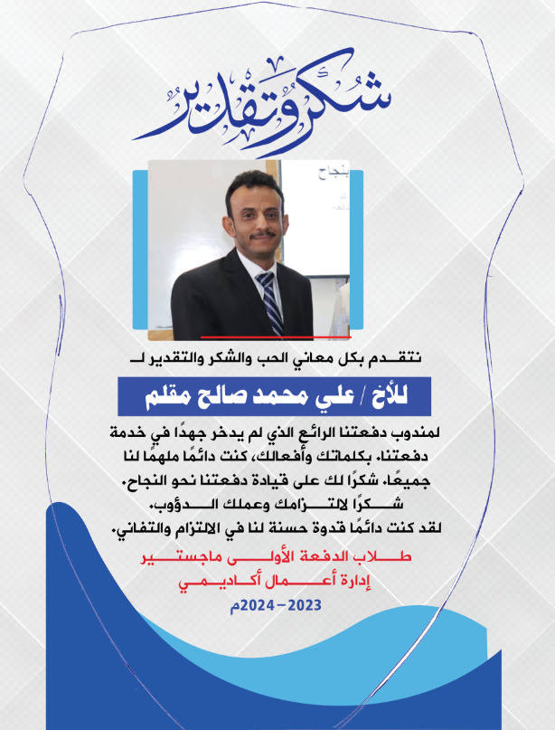 مع اختتام العام الدراسي 2023- 2024 بجامعة شبوة كلية الإدارة والاقتصاد قسم الماجستير الأكاديمي أقام طلاب الدفعة الأولى حفلًا أكاديميًا لتكريم مندوب الدفعة علي محمد صالح مقلم بدرع الدفعة الأولى تقديرًا وامتنانًا من زملائهم لما قدمه خلال مشوارهم وتحصيلهم العلمي وقيادتهم نحو النجاح ومن جانبه شكر مندوب الدفعة علي محمد صالح مقلم إخوته على هذا الكرم والفتة الطيبة التي اعتبرها وسام شرف يفتخر به وأشاد بن مقلم بالجهود المبذولة من عمادة الكلية والأساتذة ودورهم في نجاح العملية التعليمية وتحقيق نجاح مثمر نهاية العام لإخراج جيل أكاديمي لخدمة شبوة خاصة والوطن عمومًا