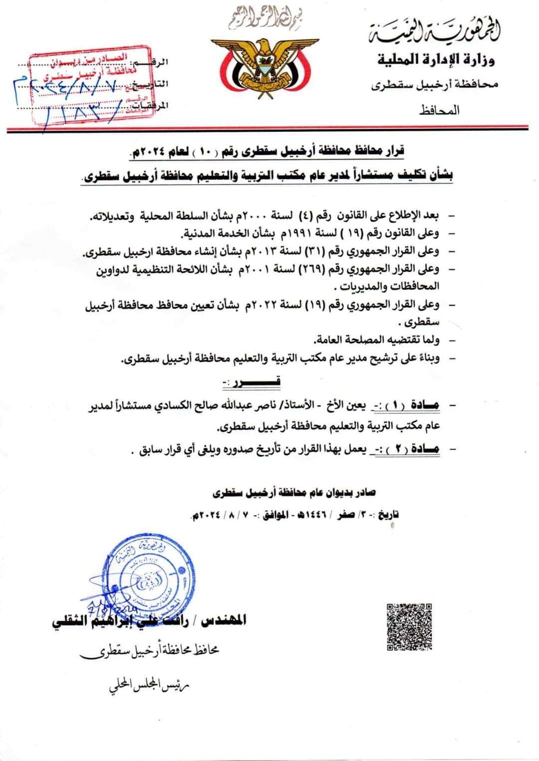 محافظ سقطرى يصدر قراراً بشأن تكليف مستشاراً لمدير عام مكتب التربية والتعليم بالمحافظة