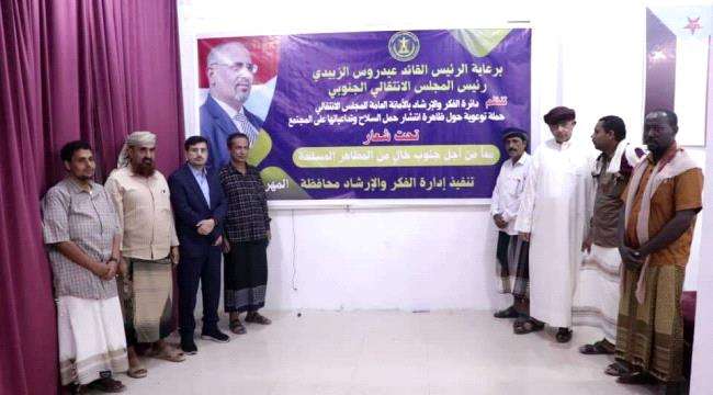 دشنت إدارة الفكر والإرشاد بالهيئة التنفيذية للقيادة المحلية للمجلس الانتقالي الجنوبي في محافظة المهرة، الخميس، حملة توعوية بعنوان "ظاهرة انتشار حمل السلاح وتداعياتها على المجتمع".