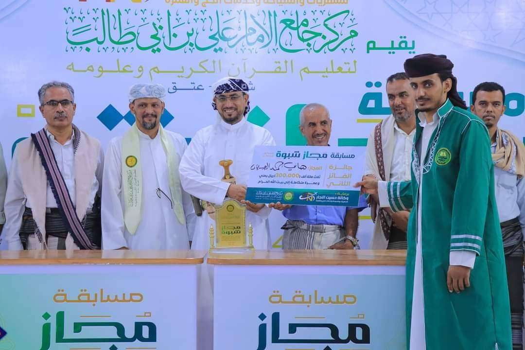 اختتم في مركز جامع الإمام علي، بمدينة عتق، مركز المحافظة، المرحلة الأخيرة من مسابقة مجاز شبوة في تلاوة القرآن الكريم، وتكريم الثلاثة الأوائل الفائزين بها، عمرو الحاج، و هاني الهيسلان، و منصور بربر. وخلال الحفل، هنأ وزير الأوقاف والإرشاد، محمد شبيبة، ووكيل المحافظة، الدكتور عبدالقوي لمروق، الفائزين بالمسابقة، مثنيان على إهتمام المحافظ بن الوزير، بهذه المحافل القرآنية المباركة، و تواصل دعمه لخدمة كتاب الله، مثمنان دور المركز في صناعة الأجيال الحافظة له، و المجيدة لعلوم قراءته. من جانبه، رحب مدير المركز سالم الوبح بالحاضرين، منوها بصعوبة هذا النوع من المسابقات القرآنية لقلة مراجعها، والمتنافسين فيها. وفي ختام الحفل، تم تكريم الفائزين بالمسابقة بالجوائز المادية المخصصة لها. حضر الحفل التكريمي، مدير عام مديرية عتق، عبدالله الخليفي، ونائب مدير مكتب الأوقاف بالمحافظة، احمد بن صائل، والمهندس حسن البرمة، والأمين العام لجمعية تحفيظ القرآن الكريم بالمحافظة، فيصل لاهم،