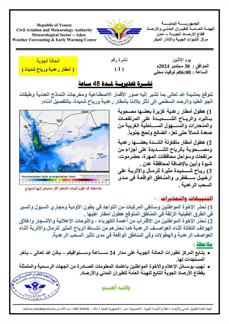 أكد مركز التنبؤات الجوية والإنذار المبكر في الهيئة العامة للطيران المدني والأرصاد، في نشرته الجوية التحذيرية الصادرة مساء اليوم الاثنين 30/9/2024، أن صور الأقمار الاصطناعية ومخرجات النماذج العددية وطبقات الجو العليا والرصد السطحي، تشير إلى تأثر بلادنا بأمطار رعدية ورياح شديدة خلال الساعات القادمة. وبناء على ذلك، توقع المركز - بمشيئة الله تعالى - خلال الـ48 ساعة القادمة، الآتي: 1) هطول أمطار رعدية غزيرة بعضها مصحوبة بالبرد والرياح الشديدة، على المرتفعات والمنحدرات والسهول الساحلية الغربية، من صعدة شمالاً حتى تعز والضالع ولحج جنوباً. 2) هطول أمطار متفاوتة الشدة بعضها رعدية ومصحوبة بالرياح الشديدة، على أجزاء من مرتفعات وسواحل محافظات (المهرة، حضرموت، شبوة وأبين)، بالإضافة إلى محافظة عدن. 3) رياح شديدة مثيرة للرمال والأتربة على أرخبيل سقطرى والمناطق الواقعة في مدى السحب الرعدية. وحذر مركز التنبؤات الجوية والإنذار المبكر المواطنين وسائقي المركبات، من التواجد في بطون الأودية ومجاري السيول، والسير في الطرق الطينية الزلقة في المناطق المتوقع هطول أمطار عليها. كما حذر من الاقتراب من أعمدة الكهرباء واللوحات الإعلانية والأشجار، مشدداً على ضرورة إغلاق الهواتف النقالة أثناء العواصف الرعدية. كما حذر المركز من نشاط الرياح المثير للرمال والأتربة أثناء العواصف الرعدية والهطولات، وفي المناطق الواقعة في مدى تأثير السحب الرعدية. وأفاد المركز بأنه يتابع تطورات الحالة الجوية على مدار 24 ساعة القادمة، مشيراً إلى أنه سيوافي بآخر المستجدات لها، بإذن الله تعالى. وأهاب مركز التنبؤات الجوية والإنذار المبكر بوسائل الإعلام والمواطنين، باعتماد المعلومات الصادرة من الجهات الرسمية، والمتمثلة بقطاع الأرصاد الجوية التابع للهيئة العامة للطيران المدني والأرصاد.