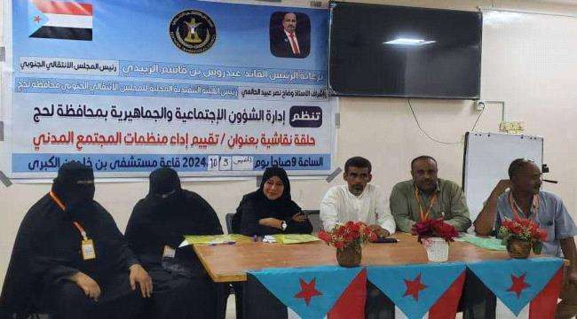 نظمت إدارة الشؤون الاجتماعية والجماهيرية بالهيئة التنفيذية للقيادة المحلية للمجلس الانتقالي الجنوبي في محافظة لحج، الخميس، ورشة عمل بعنوان "تقييم أداء منظمات المجتمع المدني بالمحافظة".