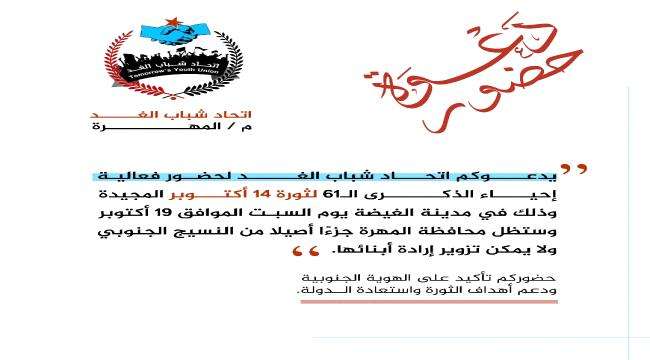 وجه اتحاد شباب الغد دعوة لكافة أبناء محافظة المهرة للمشاركة في فعالية إحياء الذكرى الـ61 لثورة 14 أكتوبر المجيدة، في مدينة الغيضة غدا السبت الموافق 19 أكتوبر.