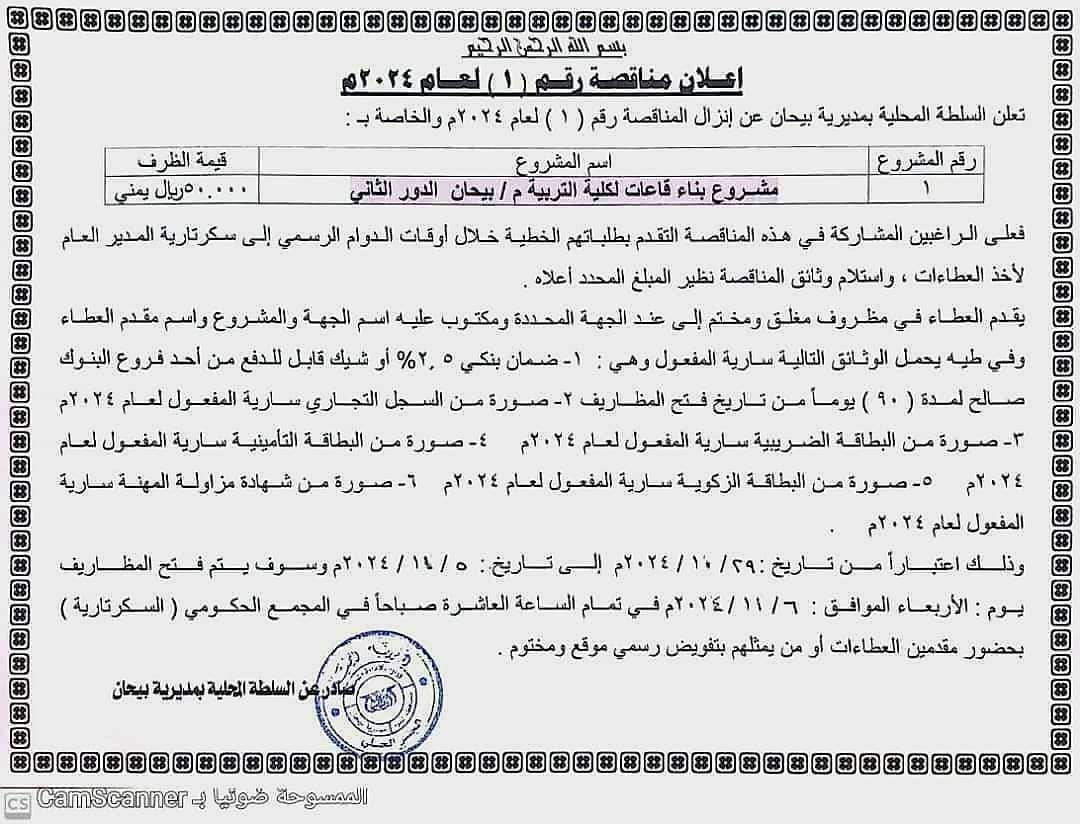 أعلنت السلطة المحلية بمديرية بيحان، بتمويل من السلطة المحلية، عن فتح مناقصة رقم (1) لعام 2024م لبناء خمس قاعات دراسية جديدة لكلية التربية في جامعة شبوة، في إطار سعي الحكومة المحلية لتعزيز البنية التحتية التعليمية ورفع مستوى التعليم العالي في المحافظة. يأتي إطلاق هذه المناقصة تواصلاً للاهتمام الكبير والدعم المستمر الذي يقدمه محافظ محافظة شبوة، رئيس المجلس المحلي، عوض محمد بن الوزير، لقطاع التعليم، حيث يتطلع المحافظ بن الوزير إلى تحقيق نقلة نوعية في جودة التعليم، وتحسين الظروف التعليمية للطلاب في المحافظة. وأكدت السلطة المحلية على أن مشروع إنشاء القاعات الدراسية يعد تكليلاً لنتائج زيارة محافظ شبوة عوض بن الوزير إلى مديرية بيحان الشهر الماضي، والتي تم خلالها استعراض احتياجات الكلية والقطاع التعليمي بشكل عام، إذ أكدت نتائج تلك الزيارة على ضرورة توفير مرافق تعليمية متطورة تساعد الطلاب على تحقيق أهدافهم الأكاديمية. وفي سياق متصل، أعرب المكتب التنفيذي لمديرية بيحان خلال انعقاد دورته الاعتيادية يوم امس برئاسة محمد أحمد شيخ الفاطمي مدير عام مديرية بيحان عن تقديره العميق للدعم والاهتمام المقدم من قبل محافظ شبوة، عوض بن الوزير، حيث تم التأكيد على أهمية هذا الدعم في تحسين مختلف الجوانب الخدمية والتنموية بالمديرية. كما تم استعراض أبرز الإنجازات التي تمت في هذا الإطار، مؤكداً على التوجه نحو تقديم خدمات أفضل للمواطنين وتعزيز أوجه التنمية في جميع المجالات، خاصة التعليم، الذي يُعتبر من أهم الأولويات. ودعت السلطة المحلية بيحان جميع المختصين والمقاولين الذين تتوفر لديهم الخبرات والشروط اللازمة، للمشاركة في هذه المناقصة، بحسب الأعلان المرفق.