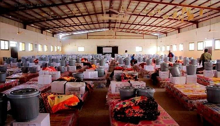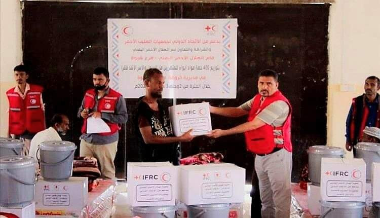 الهلال الأحمر يوزع مساعدات إيوائية للمتضررين من السيول مديرية الروضة بمحافظة شبوة.