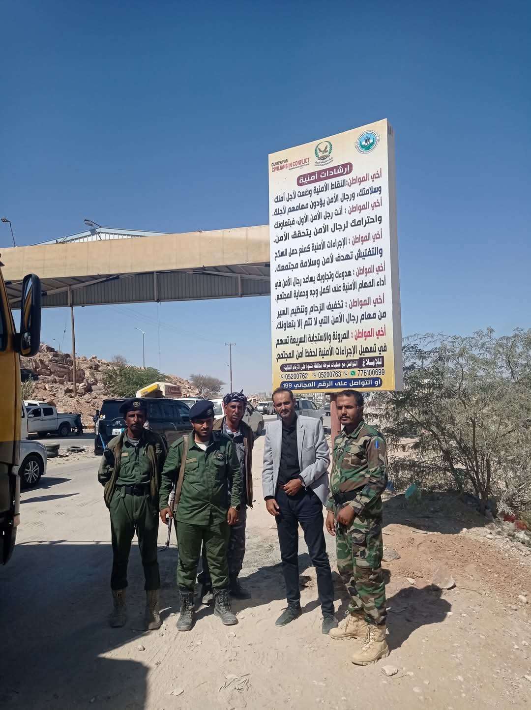 في إطار الجهود المبذولة لتعزيز الوعي لدى المواطنين بشأن التعامل مع رجال الأمن وآليات الإبلاغ عن الجرائم، تم صباح اليوم تدشين تركيب لافتات إرشادية في مداخل مدينة عتق مركز محافظة شبوة. وقد حضر التدشين النقيب توفيق الخليفي، مدير إدارة التدريب والتأهيل بشرطة محافظة شبوة، بالإضافة إلى ضباط وأفراد النقاط الأمنية. وصرح ماجد الدويل، مدير مؤسسة الشباب الديمقراطي فرع شبوة، أنه تم تثبيت لافتة إرشادية في المدخل الشرقي للمدينة "نقطة الجلفوز"، وأخرى في المدخل الشمالي "نقطة جردان"، كما سيتم تثبيت لافتة جديدة في المدخل الغربي للمدينة. وأشاد الدويل، بتعاون مدير عام شرطة محافظة شبوة، العميد الركن فؤاد محمد النسي، على اهتمامه ودعمه لتسهيل عمل الفريق المنظم لهذا النشاط. مؤكدٱ أن هذه الخطوة تأتي كجزء من مشروع تعزيز التفاعل الإيجابي بين المواطنين والجهات الأمنية لشرطة محافظة شبوة، الذي تنفذه مؤسسة الشباب الديمقراطي فرع شبوة بالشراكة مع مركز مدنيين في ظل الصراع "سيفيك". ويسعى هذا المشروع، إلى تحقيق مستوى أعلى من التعاون بين المواطنين والأجهزة الأمنية، مما يسهم في تعزيز الأمن والاستقرار في المحافظة. #
