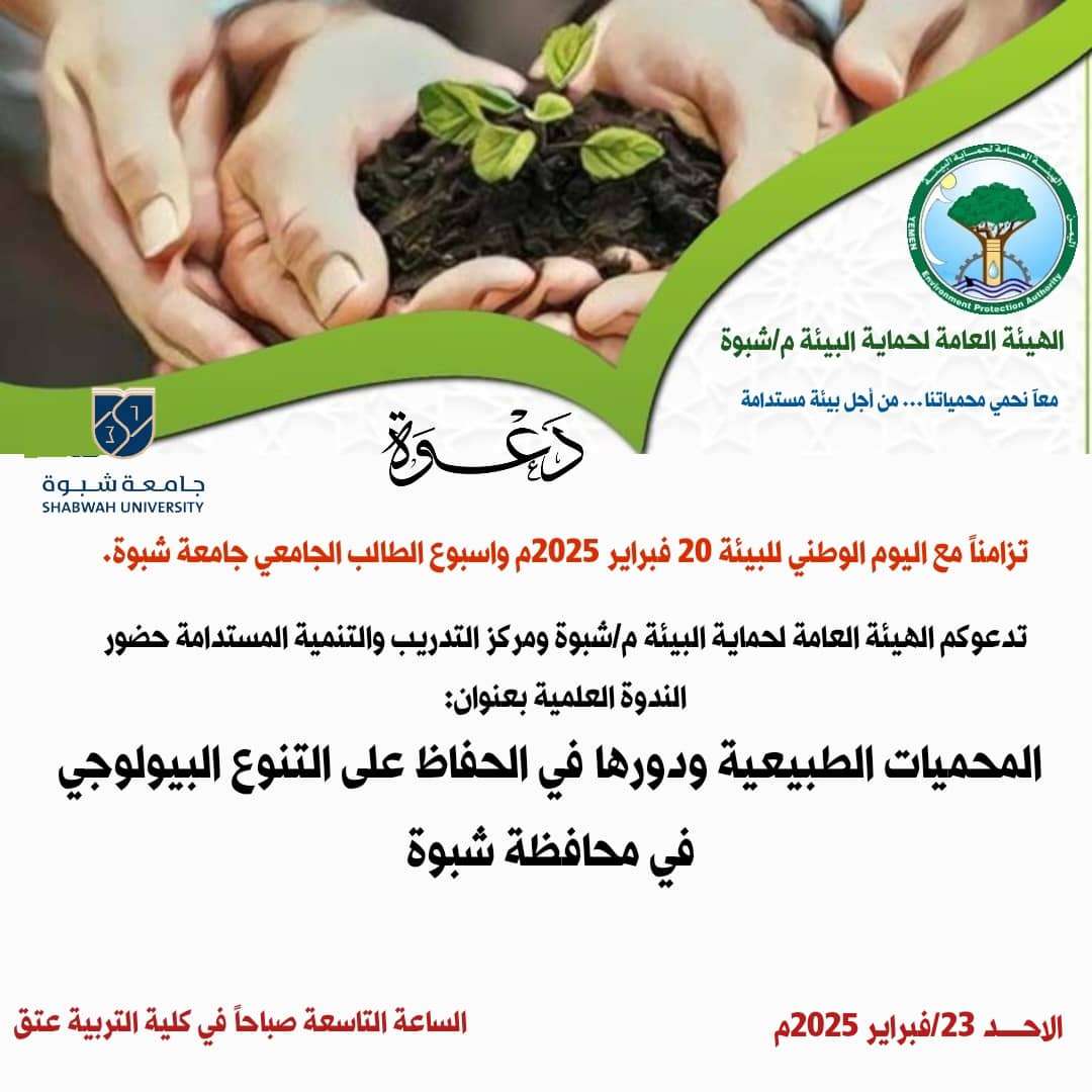 تحت شعار "معًا نحمي محمياتنا ... من أجل بيئة مستدامة" برعاية المهندس توفيق عبدالواحد الشرجبي، وزير المياه والبيئة، والشيخ عوض محمد ابن الوزير العولقي، محافظ محافظة شبوة ورئيس المجلس المحلي، تستعد الهيئة العامة لحماية البيئة فرع محافظة شبوة للاحتفال باليوم الوطني للبيئة الذي يوافق 20 فبراير. يشمل برنامج الفعاليات لقاءات توعوية تبدأ يوم الأربعاء في ثانوية مجمع السعيد بمدينة عتق، تليها محاضرات في ثانوية حنيشان للبنين يوم الخميس. حيث سيتم تقديم محاضرات إرشادية تتناول أهمية المحميات الطبيعية و دورها في الحفاظ على التنوع البيولوجي في المحافظة. كما ستعقد ندوة علمية يوم الأحد 23 فبراير تحت عنوان "المحميات الطبيعية ودورها في الحفاظ على التنوع البيولوجي في محافظة شبوة"، بالتعاون مع مركز التدريب والتنمية المستدامة بجامعة شبوة. تتميز محافظة شبوة بتنوع بيئاتها الساحلية والصحراوية والجبلية والزراعية، مما يزيد من أهميتها كموقع للحفاظ على أنواع نادرة و مهددة بالانقراض مثل الذئب العربي والضبع والغزال الجبلي. كما تم رصد مجموعة متنوعة من الطيور، البرمائيات، والزواحف، بالإضافة إلى الحياة البحرية الغنية. هذا ويؤكد القائمون على الفعالية أهمية حماية هذه البيئات الطبيعية لضمان استدامتها للأجيال القادمة.