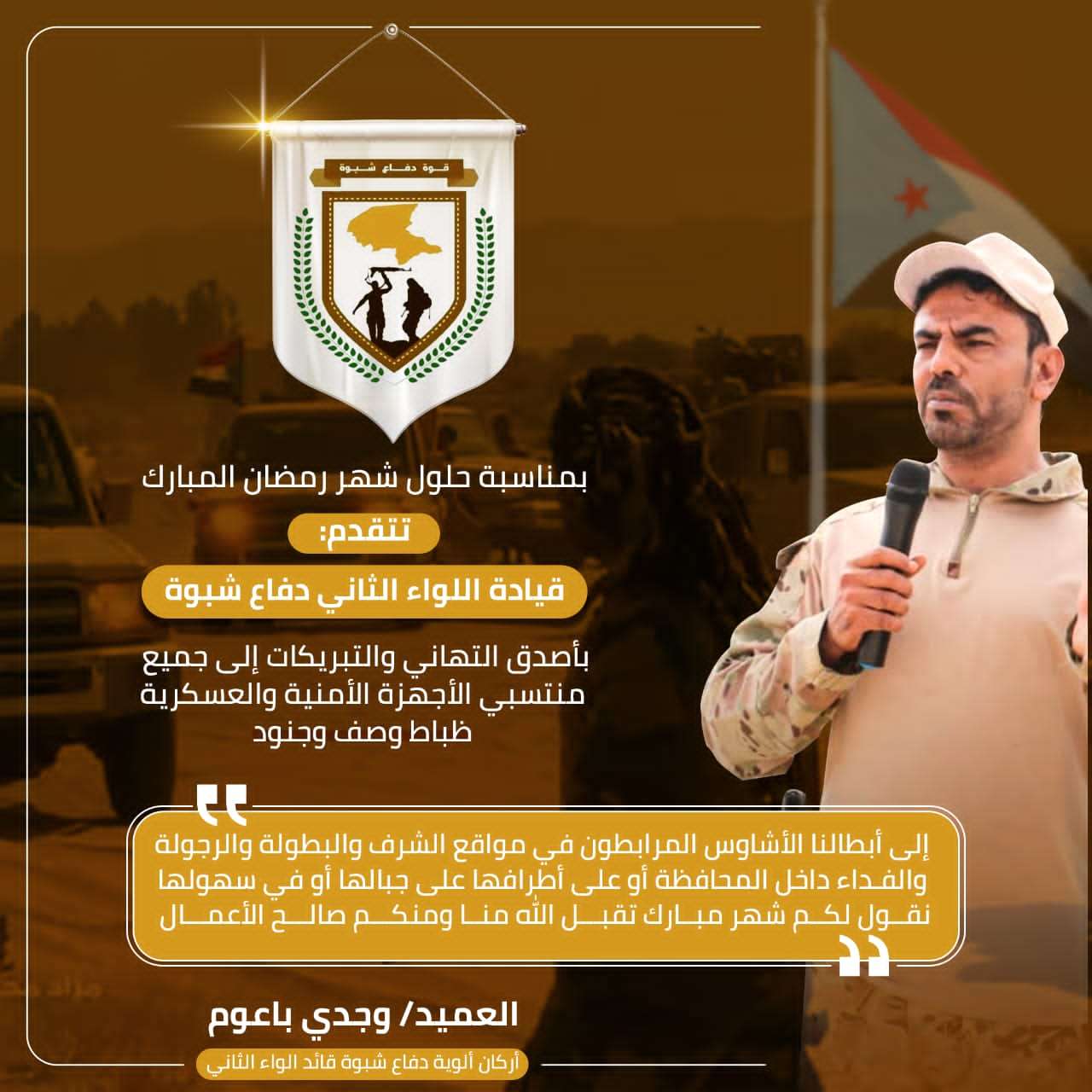 تهنئة من العميد وجدي باعوم الخليفي اركان قوات دفاع شبوة بمناسبة حلول شهر رمضان المبارك لقوات دفاع شبوه