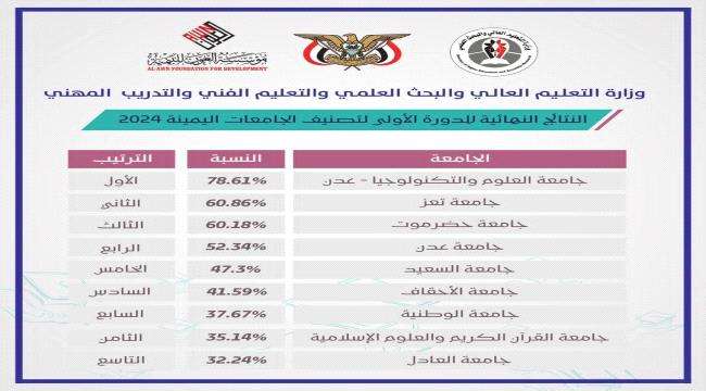 فيما حلت جامعة عدن بالمركز الرابع بنسبة 52.34 بالمائة، وجامعة السعيد في المركز الخامس بنسبة 47.3 بالمائة، وجامعة الأحقاف في المركز السادس بنسبة 41.59 بالمائة، وجاءت الجامعة الوطنية في المركز السابع بنسبة 37.67 بالمائة، وجامعة القرآن الكريم والعلوم الإسلامية في المركز الثامن بنسبة 35.14 بالمائة، وجامعة العادل في المركز التاسع بنسبة 32.24 بالمائة.