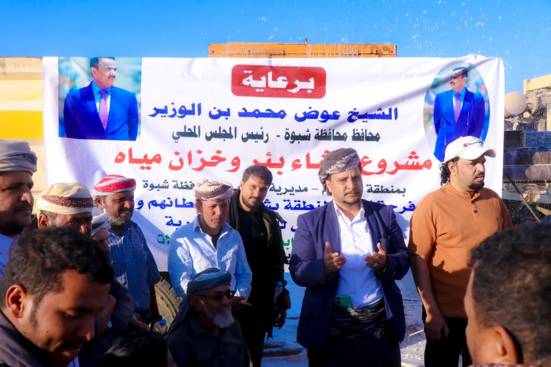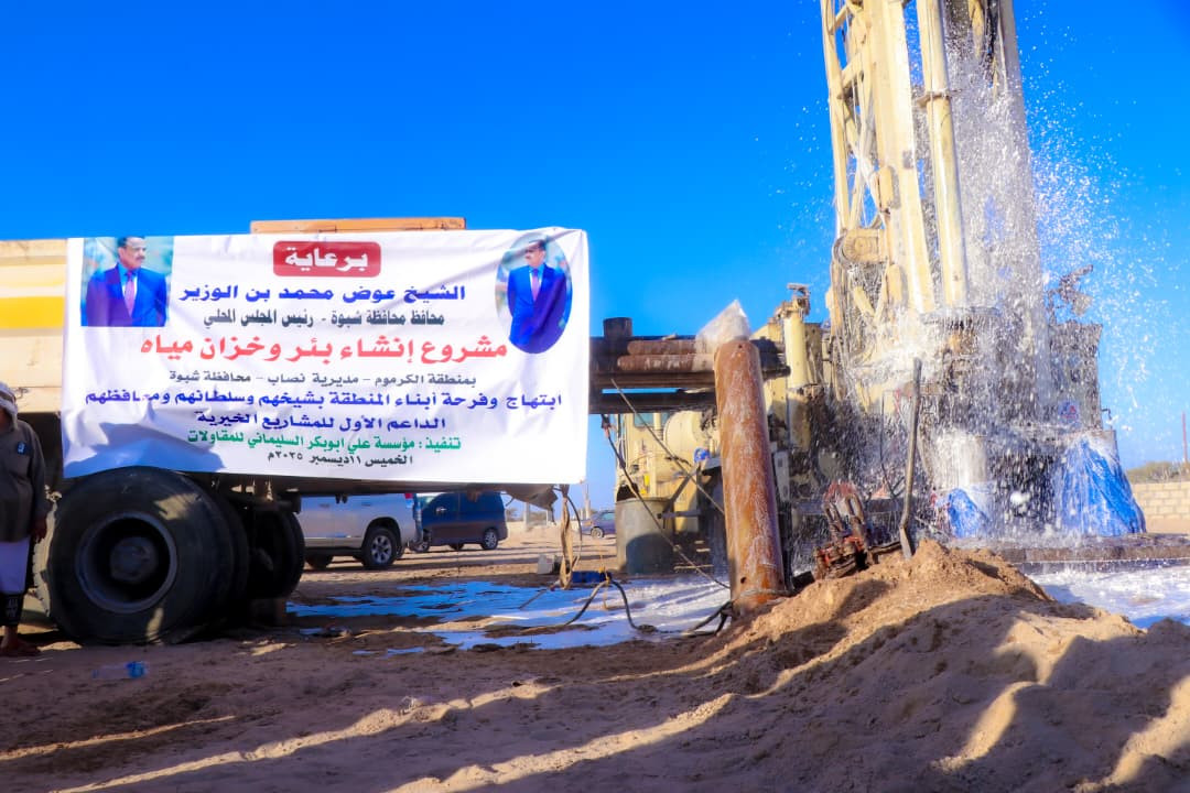 برعاية كريمة من محافظ محافظة شبوة ورئيس المجلس المحلي، الشيخ عوض محمد بن الوزير، جرى تدشين مشروع ضخ المياه بنجاح من بئر إلى خزان مياه في منطقة الكرموم بمديرية نصاب بمحافظة شبوة. ويأتي هذا المشروع تلبيةً لاحتياجات أهالي المنطقة، واهتماماً بجهود رفع مستوى الخدمات الأساسية، وفي مقدمتها المياه، ويهدف إلى توفير مصدر مياه مستدام لأهالي الكروم والمناطق المجاورة. ويُعد هذا التدشين، الذي تم يوم الخميس 19 ديسمبر 2025م، جزءاً من خطط السلطة المحلية لتعزيز البنية التحتية والخدمات في مختلف مديريات المحافظة. وقد نفّذت هذا المشروع مؤسسة علي أبوبكر السليماني لحفر الآبار الارتوازية وخدمة حقول النفط. وخلال التدشين، ألقى الأخ أسامة سالم بكران كلمة باسم أهالي منطقة الكرموم بنصاب، قدم فيها الشكر لمحافظ شبوة الشيخ عوض بن الوزير على رعايته الكريمة لحفر البئر وخزان المياه، وأشاد بجهود كل من ساهم في نجاح حفر البئر، وخص بالذكر مؤسسة علي أبوبكر السليماني لحفر الآبار، منوهاً إلى أن هذا البئر سيعود بالفائدة على جميع سكان المنطقة.