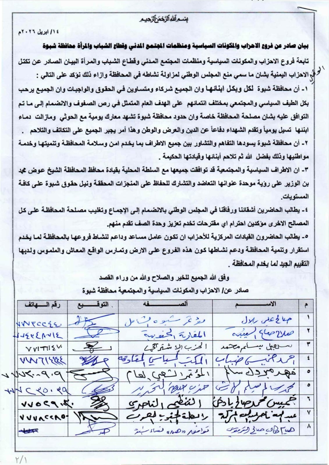 بيان موحد للأحزاب والمكونات السياسية في شبوة يؤكد التلاحم وتغليب المصلحة العامة