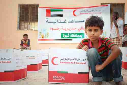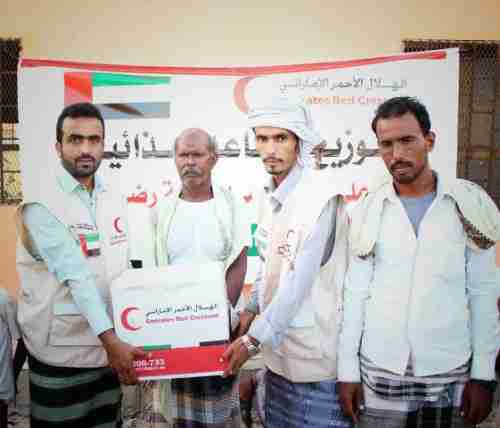 الهلال الأحمر الإماراتي يواصل توزيع المساعدات الغذائية على أهالي رضوم في شبوة.