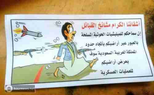 أسقطت طائرات التحالف العربي منشورات تهديدية لمشائخ القبائل القريبة من الحدود السعودية باستهدافهم، في حال سماحهم لمسلحي مليشيات الحوثي بالمرور إلى الحدود السعودية. وبحسب المنشور الذي حصلت علية واسائل اعلام صورة منه: أشقائنا الكرام مشائخ القبائل: إن سماحكم للمليشيات الحوثية المسلحة بالعبور عبر أراضيكم باتجاه حدود المملكة السعودية سوف يعرض أراضيكم للعمليات العسكرية.