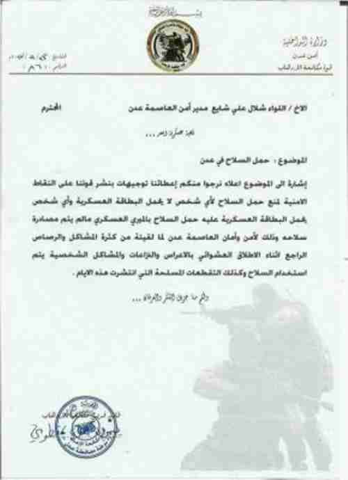 أكد قائد مكافحة الإرهاب إستعداده لنشر قواته في النقاط الأمنية لمنع حمل السلاح في عدن . وفي برقية بعث بها قائد فريق مكافحة الإرهاب يسران المقطري لمدير أمن عدن جاء فيها: الموضوع:حمل السلاح في عدن إشارة الى الموضوع اعلاه نرجو منكم إعطائنا توجيهات بنشر قواتنا على النقاط الأمنية لمنع حمل السلاح لاي شخص لايحمل البطاقة العسكرية واي شخص يحمل البطاقة العسكرية عليه حمل السلاح بالميري العسكري مالم يتم مصادرة سلاحه وذلك لامن وامان العاصمة عدن لما لقيته من كثرة المشاكل والرصاص الراجع اثناء الاطلاق العشوائي بالاعراس والنزاعات والمشاكل الشخصية يتم استخدام السلاح وكذلك التقطعات التي انتشرت هذه الايام .