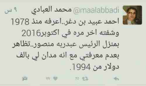 كشف سفير جنوبي سابق عن إعطائه مبلغ 1000 دولار كسلفه لرئيس الوزراء احمد عبيد بن دغر الذي تظاهر في أخر لقاء جمعهم بعدم معرفته به . وقال السفير الجنوبي محمد العبادي:اعرف احمد عبيد بن دغر منذ عام 1978م وشفته اخر مرة في اكتوبر عام 2016م بمنزل الرئيس عبدربه منصور. واضاف:تظاهر بعدم معرفتي مع انه مدان لي بالف دولار من 1994م.