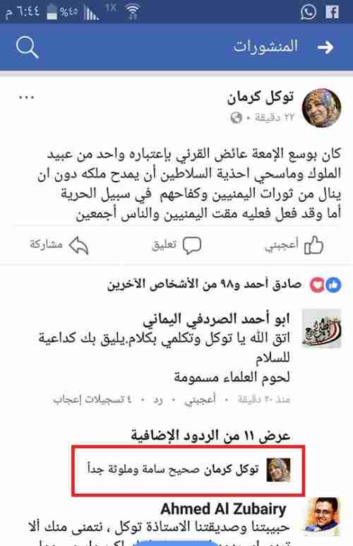 في هجوم جديد وخروج عن اللائق، هاجمت القيادية الاخوانية توكل كرمان، علماء المملكة العربية السعودية، واصفة اياهم بان لحومهم سامة وملوثة. وكتبت كرمان منشورا، وصفت فيه الداعية الاسلامي السعودية عائض القرني بإنه ” إمعة” وواحد من عبيد الملوك وماسحي احذية السلاطين . حد وصفها . قبل ان تعلق على نفس منشورها لتصف علماء السعودية بان لحومهم سامة وملوثة. وفي السياق، شن نشطاء وصحفيون اخوانيون هجوما على الداعية السعودية عائض القرني، وكل علماء السعودية، بالتزامن مع حملاتهم المستمرة ضد التحالف العربي، ودور المملكة العربية السعودية والامارات العربية المتحدة في اليمن، الساعي لانقاذ اليمن من مليشيات الحوثيين والمخلوع صالح الموالية لإيران.