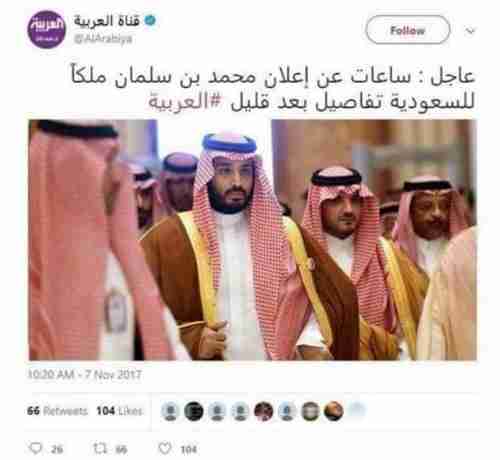 وقالتغريدة جاء فيها: “عاجل، ساعات عن إعلان محمد بن سلمان ملكاً على المملكة العربيّة السعوديّة، … تفاصيل بعد قليل"