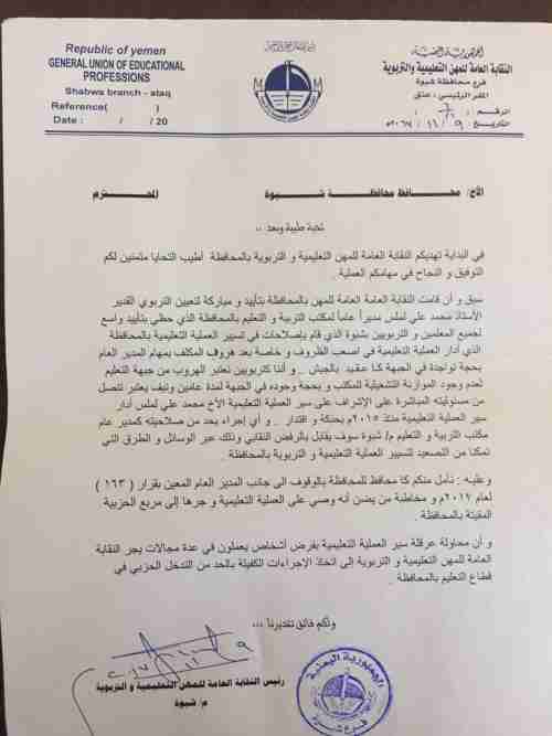 قالت نقابة المهن التعليمية والتربوية بمحافظة شبوة أنها سبق وأيدت وباركت تعيين التربوي القدير الأستاذ محمد علي لملس كمديراً عاما لمكتب التربية والتعليم بالمحافظة؛ الذي حظي بتأييدٍ وإجماع واسع من قبل جميع المعلمين والتربويين بشبوة.. مشيرةً إلى أنه قام بمنظومة إصلاحات في أصعب الظروف التي واجهت المؤسسة التعليمية. وإعتبرت النقابة في مذكرتها الموجهة لمحافظ محافظة شبوة غياب المدير السابق عن الإشراف المباشر على سير العملية التعليمية هروباً ناتجاً عن إنعدام النفقات والموازنات التشغيلية. وأكدت رفضها المطلق لأي إجراءات تحد من صلاحيات الأستاذ محمد علي لملس كمدير عاماً لمكتب التربية والتعليم.. مشيدةً بإدارتة للعملية التعليمية والتربوية بمستوى عالٍ من الحنكة والإقتدار ينم عن مدى كفاءتة وجدارتة لقيادة دفة الصرح التربوي بالمحافظة. وطالبت المذكرة محافظ محافظة شبوة اللواء علي بن راشد الحارثي، الوقوف إلى جانب المدير العام المعين بموجب القرار الصادر عن رئاسة مجلس الوزراء برقم (163) لعام 2017م. وحذّرت النقابة الجهات التي تحاول فرض وصايتها على المؤسسة التربوية من أي محاولات لجرّ العملية التعليمية إلى مربع الحزبية المقيتة بالمحافظة.. وشددت في مطالبتها على عدم السماح لأي جهات سياسية بفرض أشخاصا يعملون في عدة مجالات على هرم المؤسسة التعليمية. وأشارت نقابة المهن التربوية والتعليمية في مذكرتها بأنها ستتخذ كافة الإجراءات الكفيلة بالحد من التدخل الحزبي في قطاع التعليم بالمحافظة عبر الوسائل والطرق التي تمكن النقابة من التصعيد في إطار الجوانب القانونية.