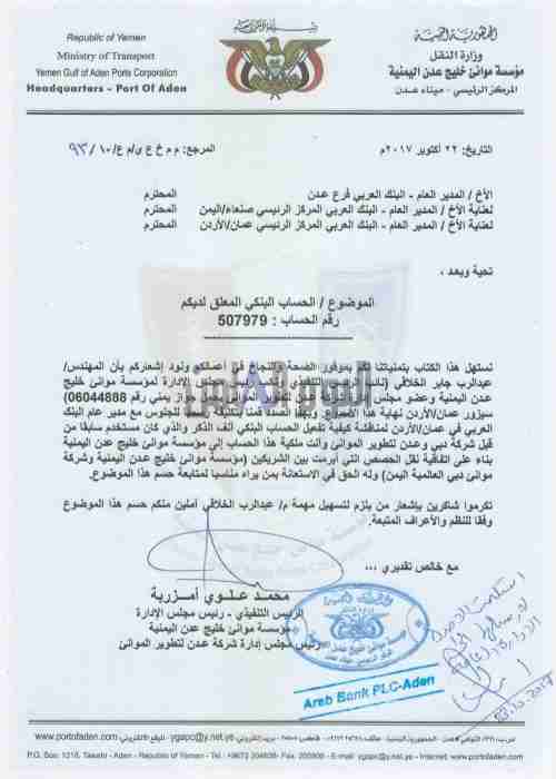 بعد يوم من تقديم محافظ عدن عبدالعزيز المفلحي لاستقالته واتهامه لحكومة بن دغر بالفساد وعرقلة جهود السلطة المحلية ، وتأكيد على ان رد بن دغر حول تهريبه 5مليار ريال من حساب محافظة عدن لحسابه في الخارج غير مبرر ، وقبلها اتهام رئيس الوزراء السابق بحاح للحكومة بنهم 666مليار ريال. تتوالى فضائح فساد الشرعية اليمنية حيث أظهرت وثيقة رسمية مساعي مسؤول موالي للرئيس هادي للسطو على 7مليون ريال تعود لموانئ عدن ودبي. الوثيقة الموجهة من محمد علوي امزربة الرئيس التنفيذي – رئيس مجلس ادارة مؤسسة موانئ خليج عدن اليمنية، ورئيس مجلس ادارة شركة عدن لتطوير الموانئ ، للبنك العربي ، يسعى من خلالها امزربة الموالي لهادي للسطو على وديعة في حساب البنك العربي بالأردن ، من خلال مطالبته بتحرير حساب البنكي العائد لشركة دبي وعدن، لنهبها تحت اسم حساب مؤسسة موانئ خليج عدن. وجاء في الوثيقة : "الأخ المدير العام – البنك العربي فرع عدن المحترم لعناية الأخ المدير العام – البنك العربي المركز الرئيسي صنعاء اليمن لعناية الأخ المدير العام – البنك العربي – المركز الرئيس عمان/ الأردن. تحية وبعد الموضوع الحساب البنك المعلق لديكم رقم الحساب 507979 نستهل هذا الكتاب بتمنياتنا لكم بموفور الصحة والنجاح في إعمالكم ونود اشعاركم بأن المهندس عبدالرب جابر الخلاقي (نائب الرئيس التنفيذي ونائب رئيس مجلس الإدارة لمؤسسة موانئ خليج عدن اليمنية، وعضو مجلس ادارة شركة عدن لتطوير الموانئ، يحمل جواز يمني برقم (06044888)، سيزور عمان الأردن نهاية هذا الأسبوع وبهذا الصدد قمنا بتكليفه رسمياً بالجلوس مع مدير عام البنك العربي في عمان الأردن، لمناقشة كيفية تفعيل الحساب البنكي، آنف الذكر ، والذي كان يستخدم سابقا من قبل شركة دبي وعدن لتطوير الموانئ وآلت ملكية هذا الحساب إلى مؤسسة موانئ خليج عدن اليمنية، بناء على اتفاقية نقل الحصص التي أبرمت بين الشريكين (مؤسسة موانئ خليج عدن اليمنية، وشركة موانئ دبي العالمية اليمن، وله الحق في استعانة بمن يراه مناسبا لمتابعة حسم هذا الموضوع. تكرموا شاكرين بإشعار من يلزم بتسهيل مهمة، م/ عبدالرب الخلاقي آملين منكم حسم هذا الموضوع وفقا للنظم والأعراف المتبعة. مع خالص تقديري محمد علوي امزربة الرئيس التنفيذي – رئيس مجلس ادارة مؤسسة موانئ خليج عدن اليمنية، ورئيس مجلس ادارة شركة عدن لتطوير الموانئ.
