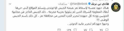 اتهم الشيخ “هاني بن بريك” وزير الدولة السابق نائب رئيس المجلس الانتقالي حزب الإصلاح بالسعي للسيطرة على المواقع المحررة في محافظة تعز بعد تحريرها من قبل المقاومة السلفية . وقال الشيخ “بن بريك” في تغريدة له على صفحته في تويتر ان حزب الإصلاح يبذل جهود مضنية لإسقاط تعز مستخدماً مصطلح الجيش الوطني، وأضاف كان الاحرى بهذا الجيش ان يحرر ما تبقى من محافظة تعز وليس محاربة السلفيين . نص تغريدة الشيخ هاني بن بريد : ” هناك جهود مضنية لإسقاط تعز بقبضة الجيش الإخونجي وتسلم المواقع التي حررها أبطال المقاومة الشرفاء الذين لم يتلوثوا بحزبية مجرمة . ذلك الجيش العاجز عن مجابهة الحوثيين ووجه كل جهوده لتحرير الجزء المحرر من محافظة تعز ، كل ذلك باسم الجيش الوطني !!! وجهوا جهودكم لتحرير مابيد الحوثي . ”