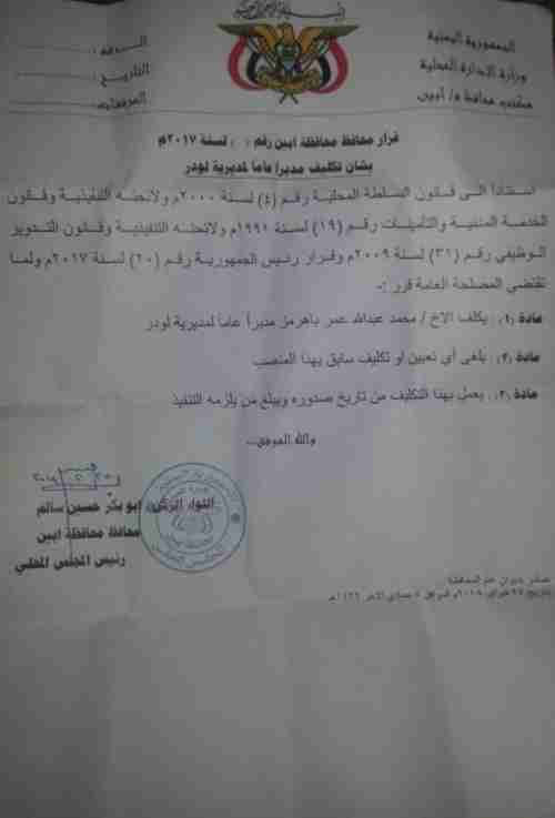 وجاء في قرار محافظ أبين الذي أصدره مساء السبت أنه (استنادا إلى قانون السلطة المحلية رقم (4) لسنة 2000م ولائحته التنفيذية وقانون التدوير الوظيفي رقم (31) لسنة 2009م وقرار رئيس الجمهورية رقم (20) لسنة 2017م ولما تقتضي المصلحة العامة قرر :
