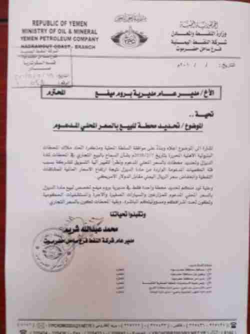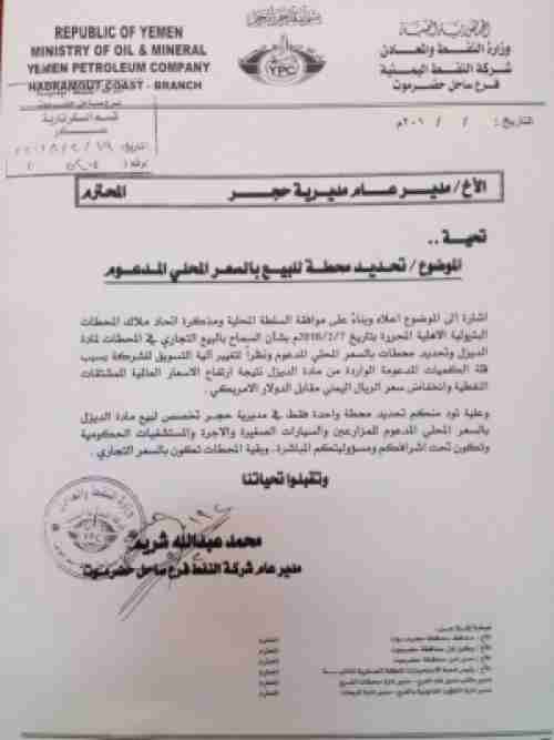 أقرت السلطة المحلية بمحافظة حضرموت واتحاد ملاك محطات البترول ألأهلية العمل بألية جديد في توزيع وبيع المحروقات والمشتقات النفطية في كافة مدن المحافظة ساحلاً ووادي في أطار جهود معالجة أزمة شحه توفر مادة الديزل. حيث ستشمل الآلية الجديدة السماح لمحطات تعبة الوقود بالبيع التجاري لمادة الديزل وتحديد محطات معينة يتم من خلالها توفير وبيعها المادة بالسعر المحلي "المدعوم". وقال مصدر مسئول في قيادة شركة النفط بساحل حضرموت أن هذه الإلية والتي تمت بالتوافق مع كل من السلطة المحلية واتحاد ملاك محطات البترول الأهلية وقيادة شركة النفط بالوادي جاءت للتخفيف من وطأة شحه المحروقات من مادة الديزل نتيجة قلة الكميات المدعومة الواردة من مادة الديزل جراء ارتفاع أسعار المادة عالمياً وانخفاض قيمة العملة الوطنية (الريال اليمني) أمام الدولار الأمريكي. وأكد المصدر المسئول بالقول أن السلطات بالمحافظة وحرصاً منها على توفير المادة للمواطنين والمصلحة العامة عمدت إلى مخاطبة سلطات المحلية في المديريات لتحديد محطة واحد في كل مدينة يتم خلالها توفير مادة الديزل بالسعر المحلي "المدعوم"، والذي سيُخصص فقط للمزارعين والسيارات الصغيرة والأجرة وكذلك المُستشفيات الحكومة. وأن تكون هذه المحطات تحت الأشراف والمسئولية المباشرة للسلطات المحلية في المديريات. على أن يتم بيع المادة بسعرها التجاري في بقية المحطات. وشدد المصدر المسئول بشركة النفط بالمحافظة على أن هنالك عدد من الضوابط تم تحديدها للمحطات التي ستقوم ببيع المادة بالسعر المحلي المدعوم وهي كالتالي: 1- عدم تعبئة القاطرات و رؤوس القاطرة وسيارات السكس والدينات والباصات السياحية وغيرها من المعدات الثقيلة كالشيولات والبوكلينات والحفارات. 2- عدم تعبئة الدبب والبراميل. 3- عدم تخزين أي مواد بترولية بأي كميات كانت من خزان المحطة مهما كانت الأسباب إلا بموافقة مسبقة من الجهات المختصة في شركة النفط. 4- يتم تعبئة السيارات بما لا يزيد عن (40) لتر لكل سيارة 5- يمنع منعاً باتا تعبئة العباري السمكية بالسعر المدعوم.
