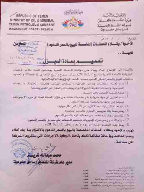وأكد المصدر المسئول بالقول أن السلطات بالمحافظة وحرصاً منها على توفير المادة للمواطنين والمصلحة العامة، عمدت إلى مخاطبة سلطات المحلية في المديريات لتحديد محطة واحد في كل مدينة يتم خلالها توفير مادة الديزل بالسعر المحلي "المدعوم"، والذي سيُخصص فقط للمزارعين والسيارات الصغيرة والأجرة وكذلك المُستشفيات الحكومة. وأن تكون هذه المحطات تحت الأشراف والمسئولية المباشرة للسلطات المحلية في المديريات. على أن يتم بيع المادة بسعرها التجاري في بقية المحطات.