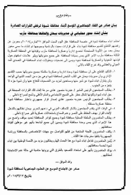 قبائل شبوة ترفض قرارات إخضاع محور بيحان لمحافظة مأرب شاهد الصور ونص البيان