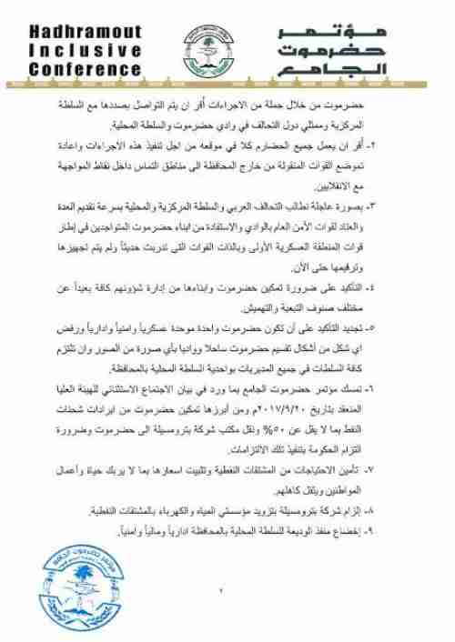 وجددت الهيئة تمسك مؤتمر حضرموت الجامع بما ورد في بيان الاجتماع الاستثنائي للهيئة المنعقد بتاريخ 20/9/2017م ومن أبرزها تمكين حضرموت من ايرادات شحنات النفط بما لا يقل عن ٥٠% ونقل مكتب شركة بترومسيلة إلى حضرموت وضرورة التزام الحكومة بتنفيذ تلك الالتزامات ، وتأمين الاحتياجات من المشتقات النفطية وتثبيت اسعارها بما لا يربك حياة وأعمال المواطنين ويثقل كاهلهم. وكذا إلزام شركة بترومسيلة بتزويد مؤسستي المياه والكهرباء بالمشتقات النفطية.